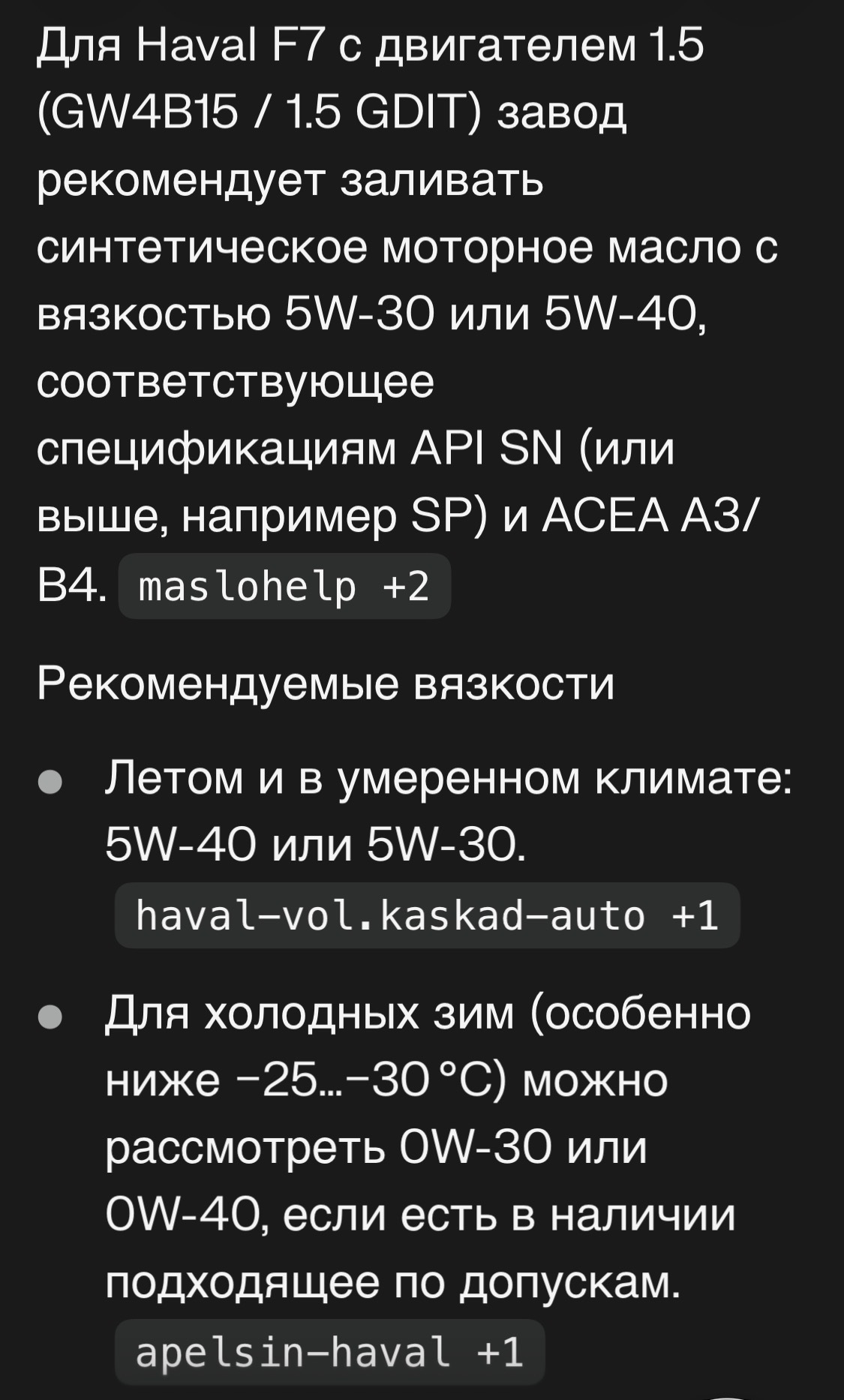 В Haval пока буду придерживаться того, что зальют на ТО по регламенту. После 100т планирую сам обслуживать, буду лить на лето 5w30 на зиму 0w20 Газпромнефть