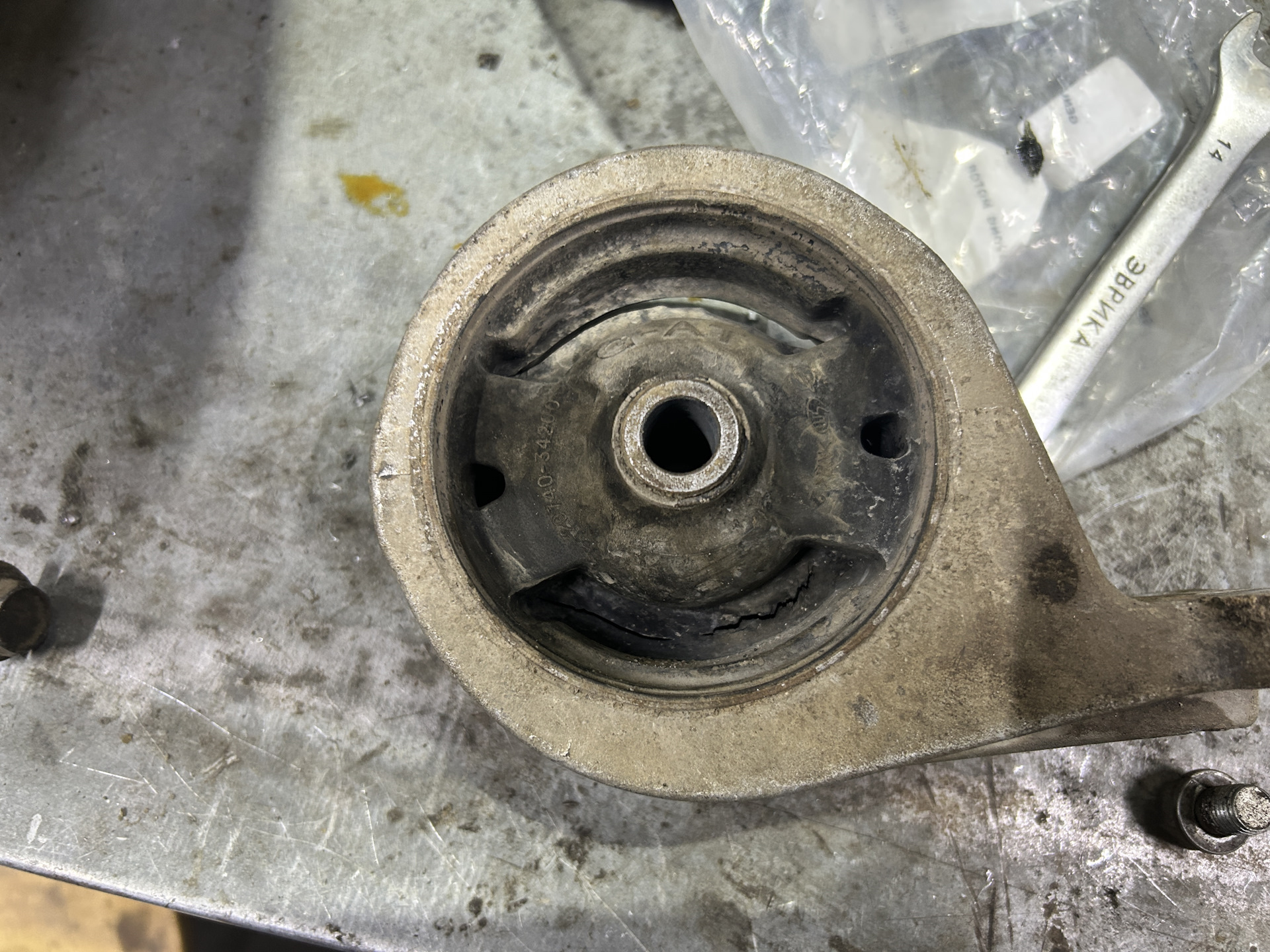 Мастер, снявший старую подушку, сказал, что верхний болт, который стоит перпендикулярно двигателю, был недокручен до упора, вследствие чего опора качалась, сломав основание. Высказал уже своё "АБВГД" человеку, который ставил двигатель на место (менял коленвал, но это — отдельная история).