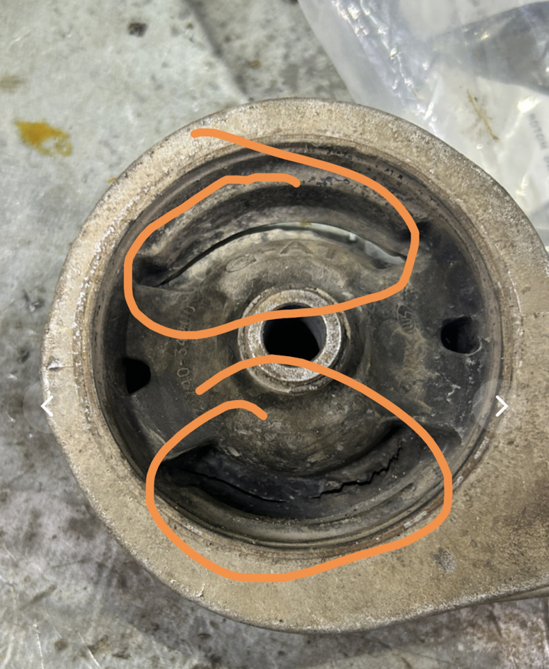 На СТО, при замене гофры, выявили поломку в задней опоре двигателя. Мало того, что сама подушка порвалась сверху и снизу, так лопнула площадка, к которой она крепится двумя болтами.