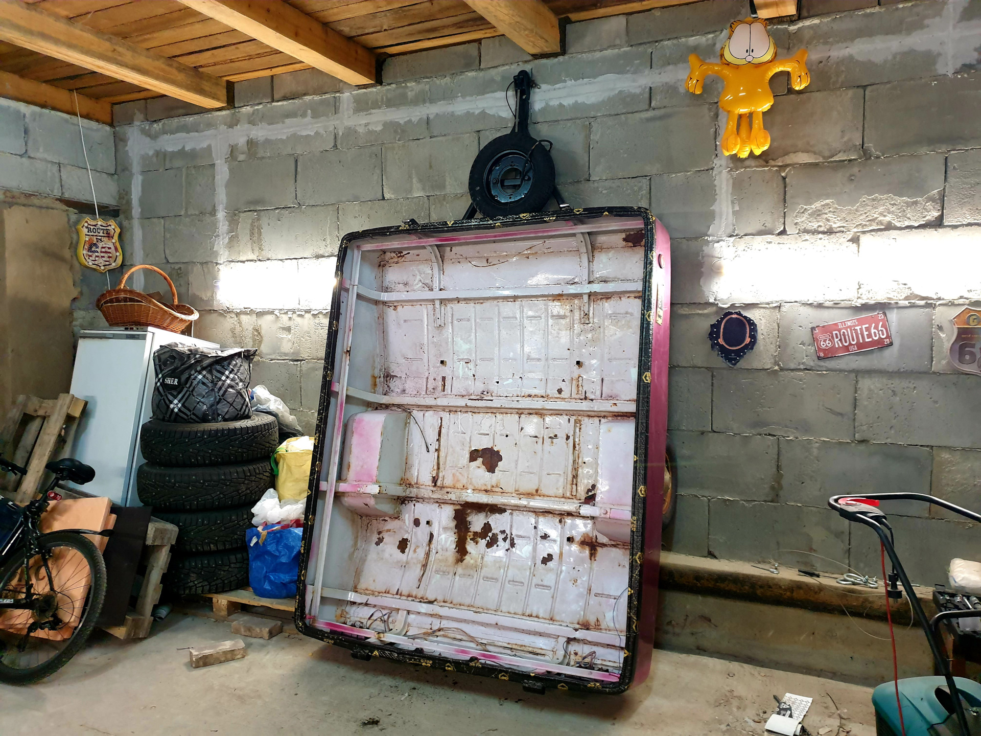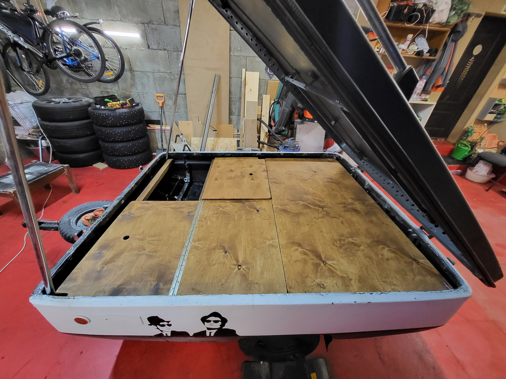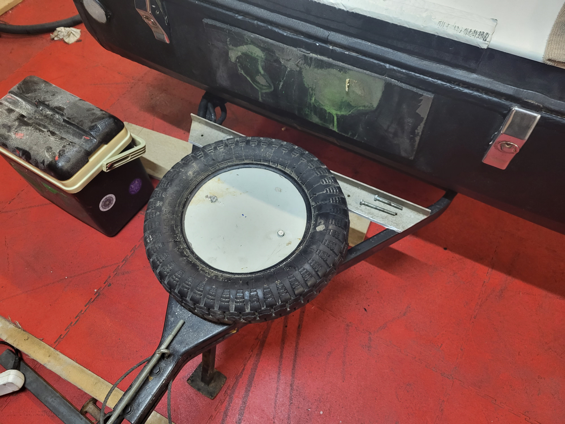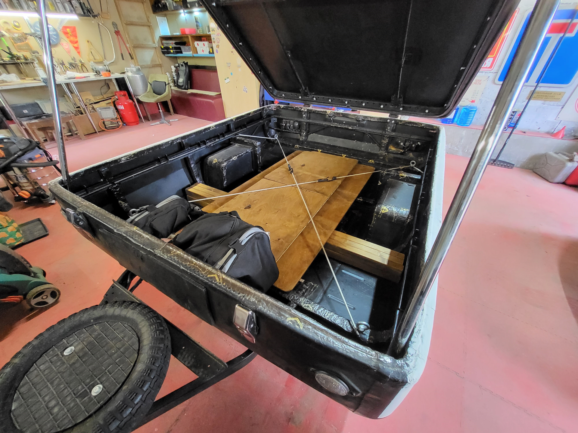 В крышке, по периметру, было много пластиковых креплений, на место которых вставлены резьбовые клепки (будущее крепление внешнего слоя палатки через люверсы с помошью мебельных болтов). Сумка на переднем плане – 4 триноги для выставления спального места в горизонт, противооткатные каблуки, запасные камеры для колес)