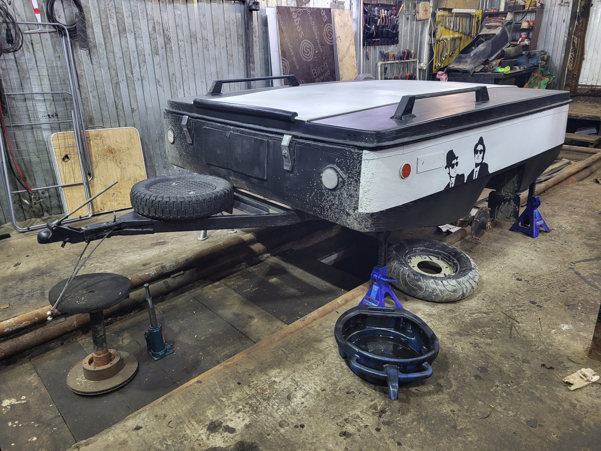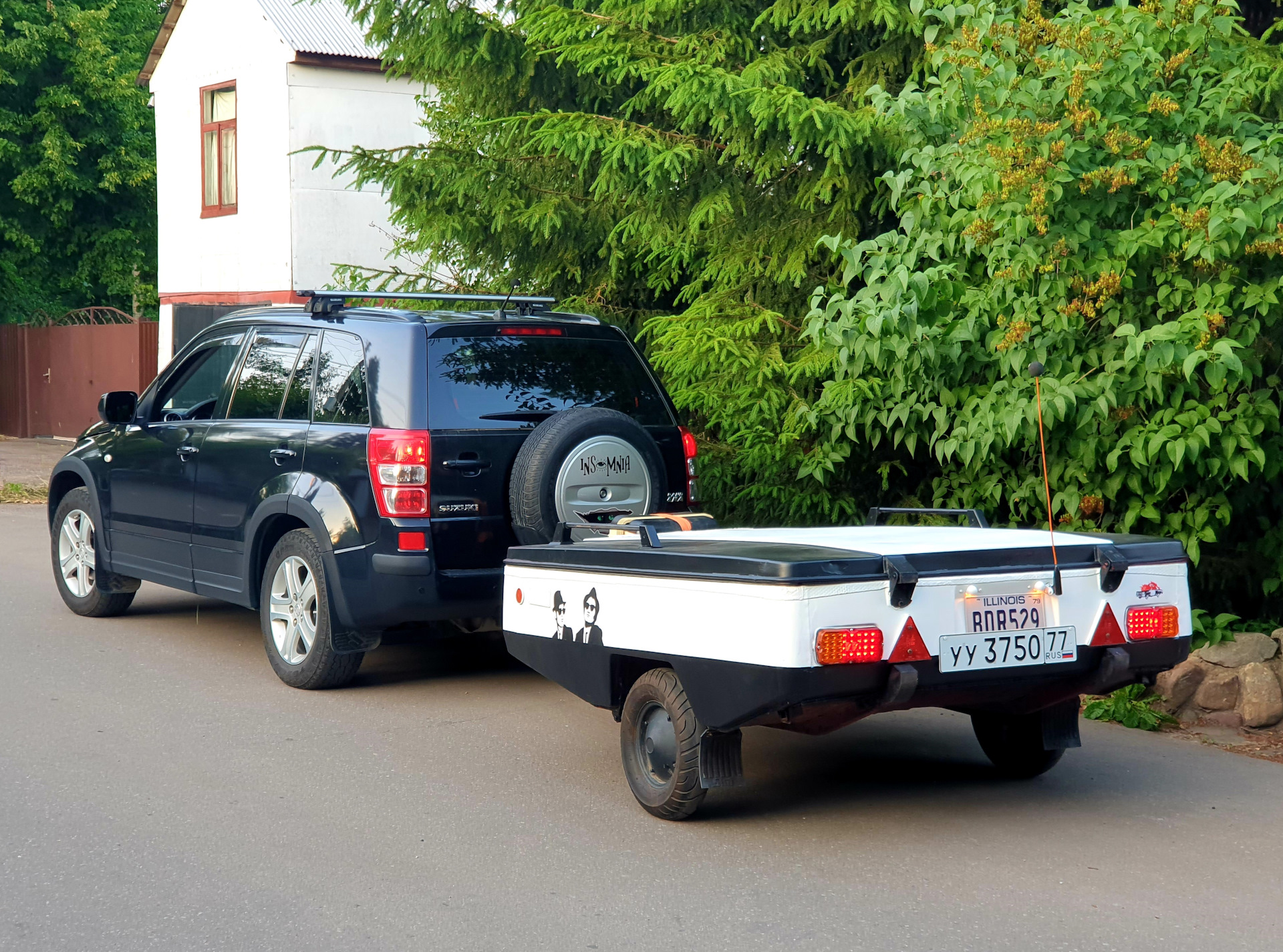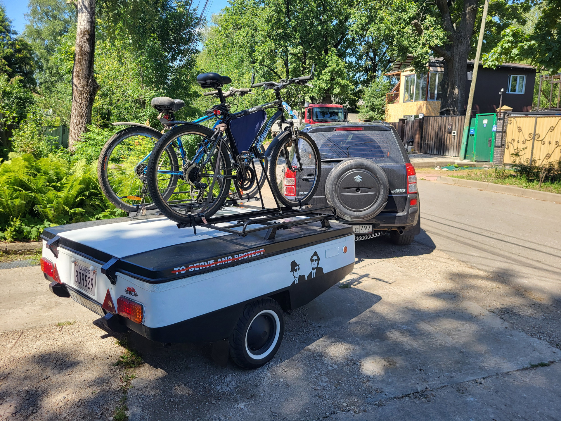 Квадратный номер 1 в 1 копия номера машины Братьев Блюз. Их же лица на бортах прицепа. Зачеркнутые надписи вдоль крышки (зачеркнутую звезду щерифа Иллинойса так и не сделал). Диски и колпаки тоже в черный. Длинная антенна является успокаювающим фактором наличия прицепа за тобой, так как в движении по прямой Скиф не виден в зеркалах.