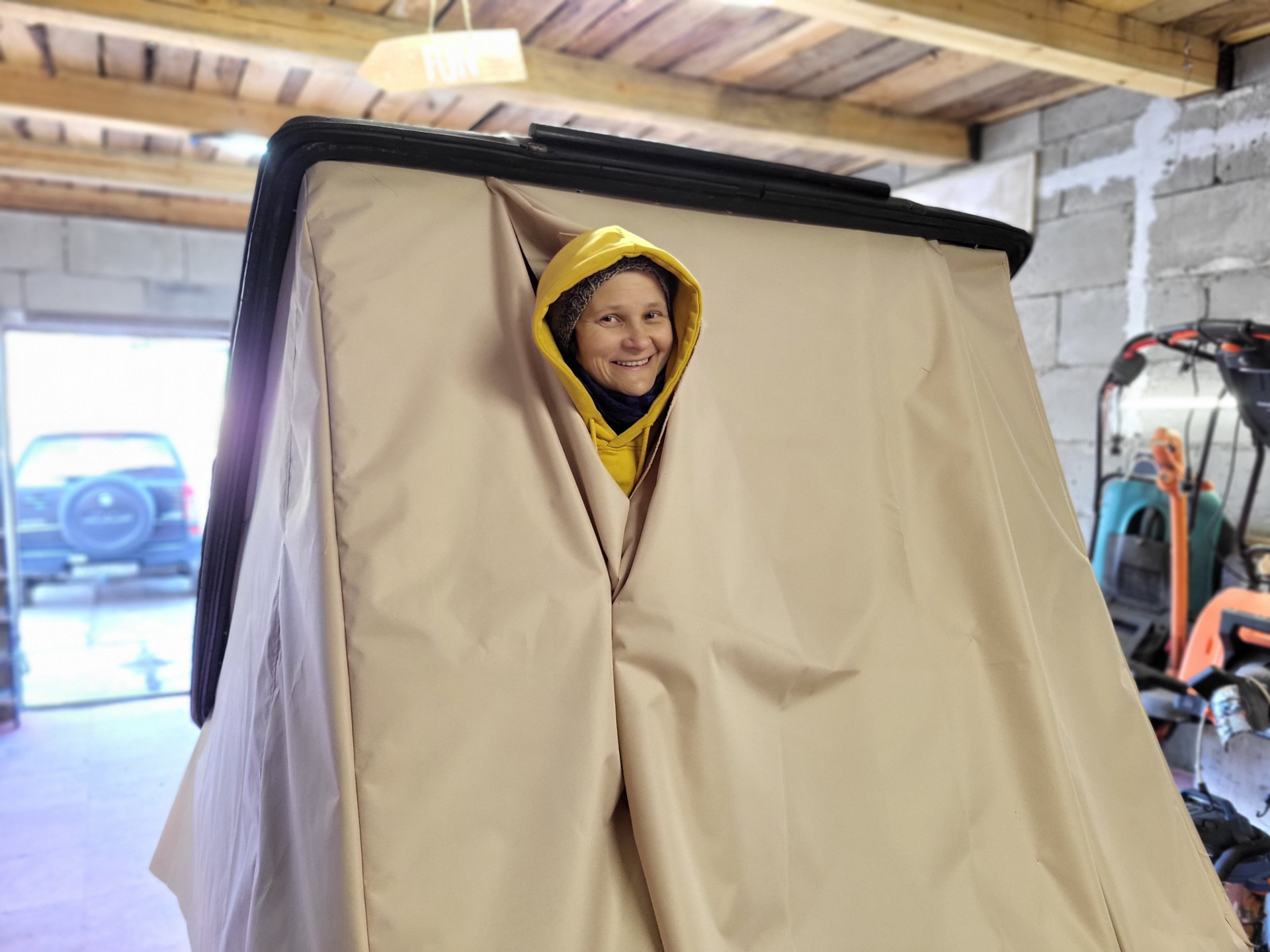 Вся эта конструкция складывается в крышку, прижимается толстым листом вспененного пластика (он же является «базовым» матрасом), и растягивается на багажных резинках