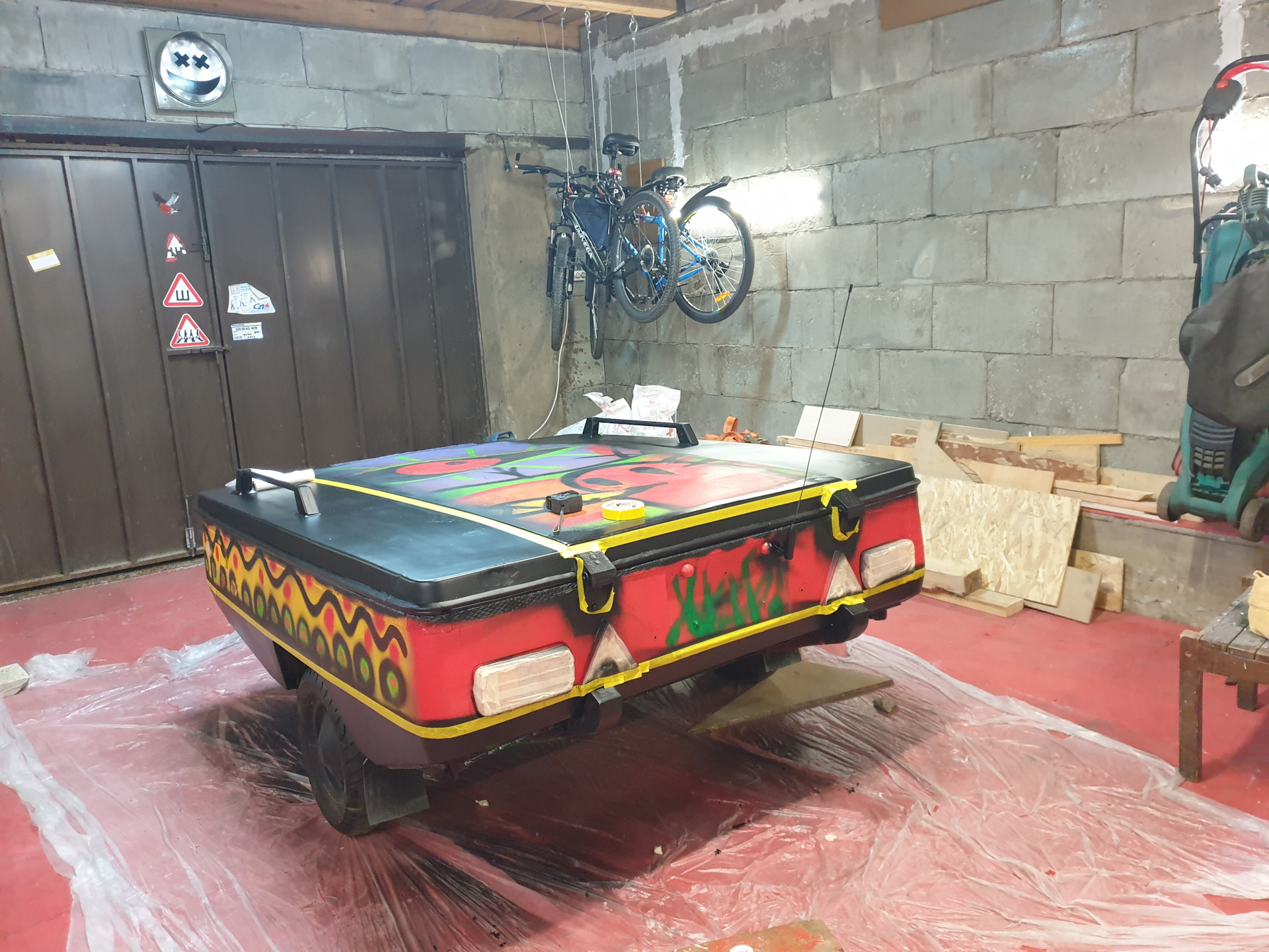 Так и жилось, пока не наступило желание сделать что – нибудь с внешкой. Розовый, конечно, не плох, но… Montana самой укрывной серии. Подготавливал, но не выравнивал. Летним фестивальным днем отдал художникам прицеп, без тз, ожидая получить что-то эстетичное, качественное, пусть и яркое (учитывая купленные мною баллоны с краской). Итог меня не приятно удивил. Ездить с этим было нельзя. За 2 поездки по городу 2 остановки доблестными инспекторами…