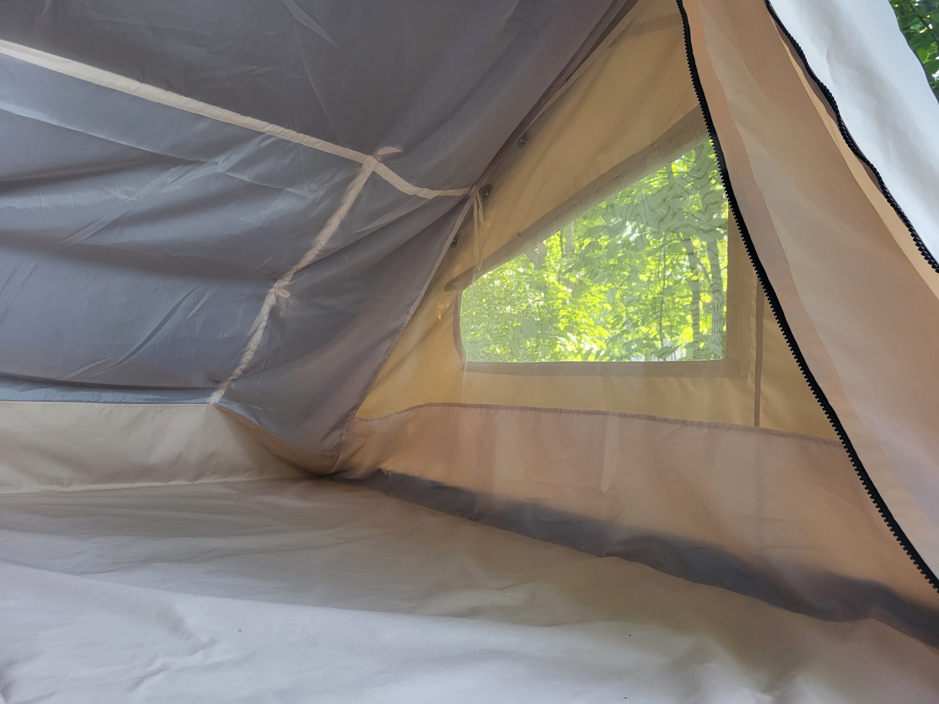 Внутренняя палатка из Таффеты. Нижняя часть из Оксфорда 600 + липучки для крепления к фанере. Крепления к крышке и стойкам через вшитые завязки + карман для поперечины между стойками. Качественные, большие молнии