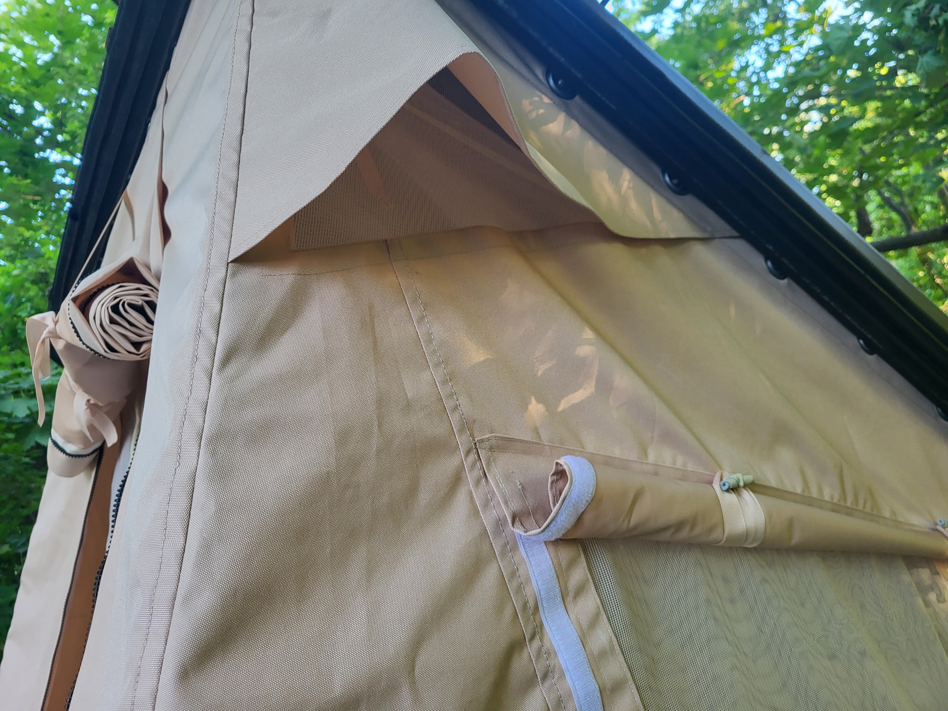 Внешняя палатка из водоотталкивающего материала Оксфорд 600. С продухами на коньке. Большие окна на липучках, и с креплением в завернутом состоянии + вшитые москитные сетки. Все швы проклеены. Крепление к крышке прицепа через люверсы. Нижняя часть не требует креплений за счет отличного прилегания к бортам (точных расчетов).