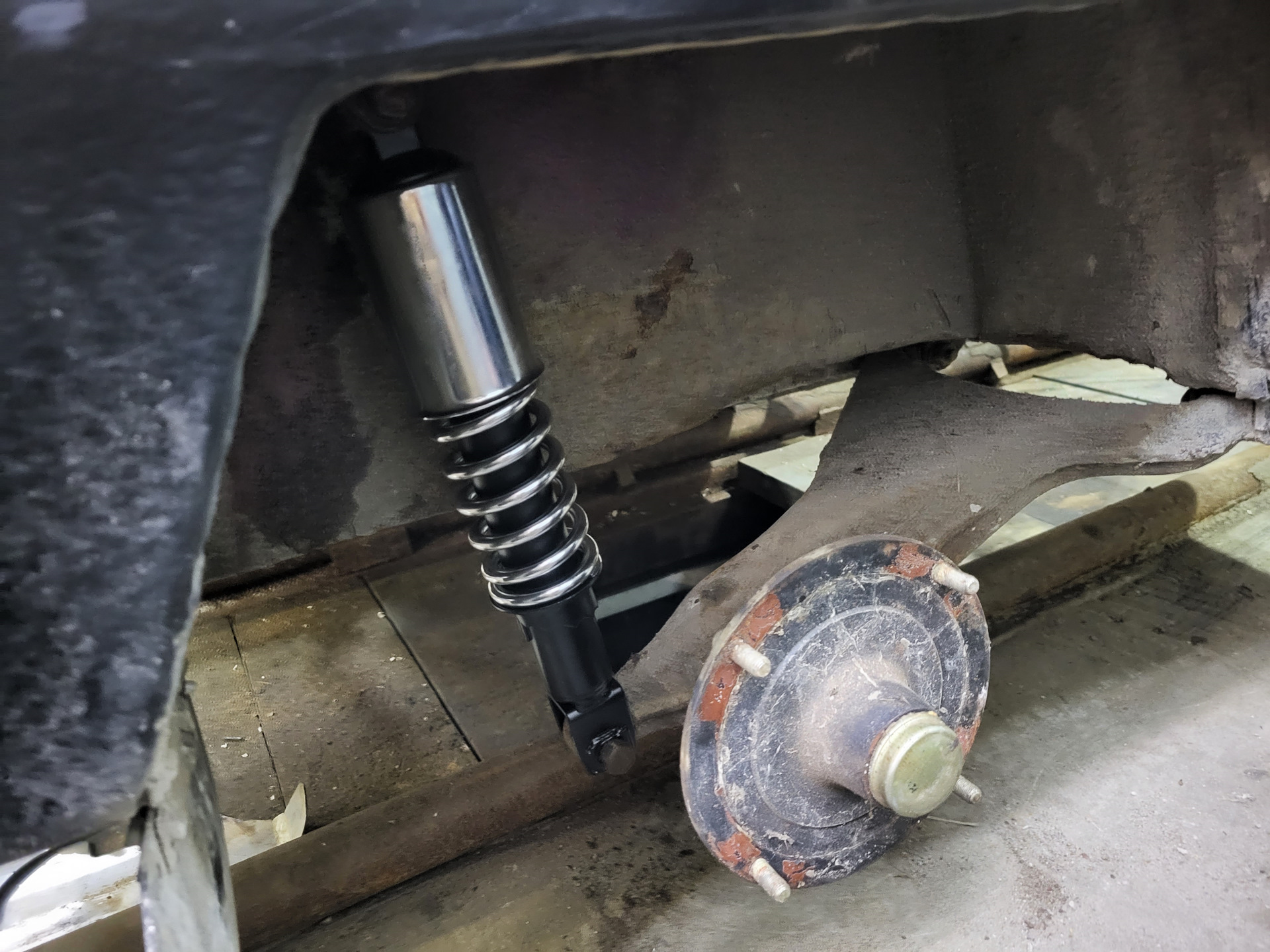 Залезли в техничку. Оказалось, что при хранении прицепа в вертикальном положении оригинальные открытые амортизаторы от Урала\Днепра вытекают на пол. Были заменены на хром Китай. На 2 см выше стока. И зря. Красивые, но вообще не работают. И с настройкой жесткости играл, и с загрузкой.