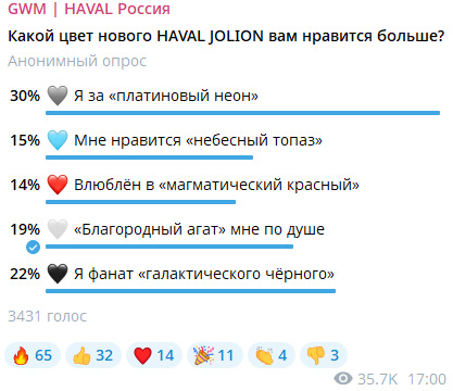 У Haval Платиновый Неон чаще других цветов фигурирует на сайте и в официальном канале в телеграме. Также натыкался на опрос в группе ВК, где было голосование и большинство проголосовало за этот цвет, как самый интересный. Когда себе выбирал, тоже такой хотел, но его не было в наличии, поэтому купил белый и доволен.