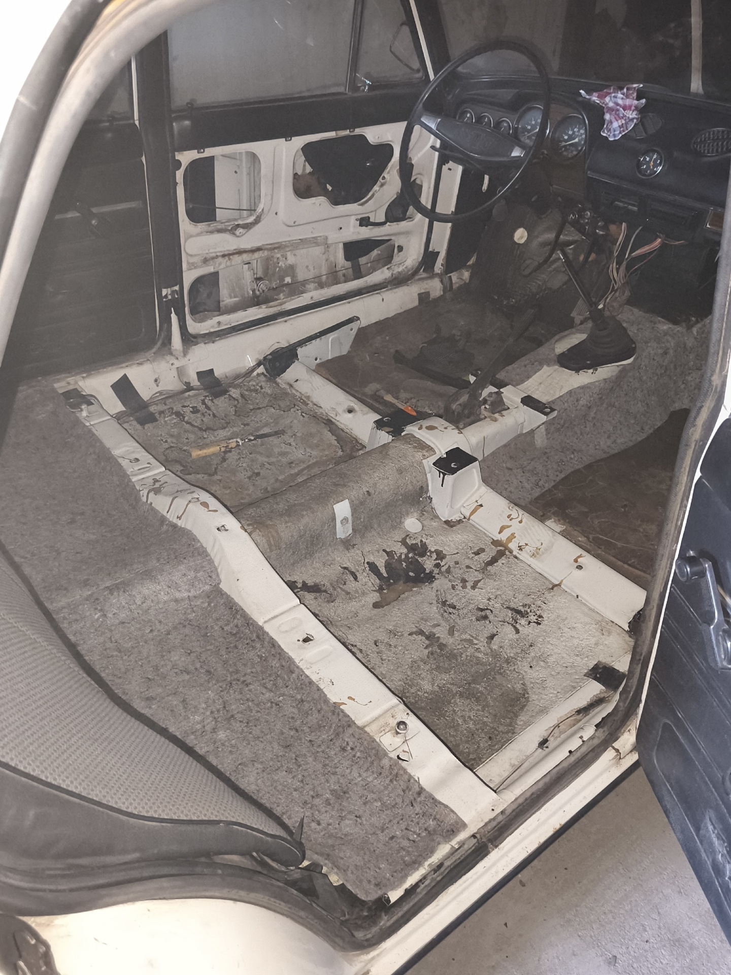 Следующим шагом с ОГРОМНЫМ удовольствием снимаю…нет…СРЫВАЮ колхозный линолеум с пола (это была моя мечта с первого дня). Думал под ним окажется девственный ковролин, но состояние у него было на 4 — или даже 3+. Особенно пострадало место рядом с рукояткой КПП. Пока сиденья сняты принимаю решение менять ковролин, заодно проверить на предмет коррозии состояние полов.