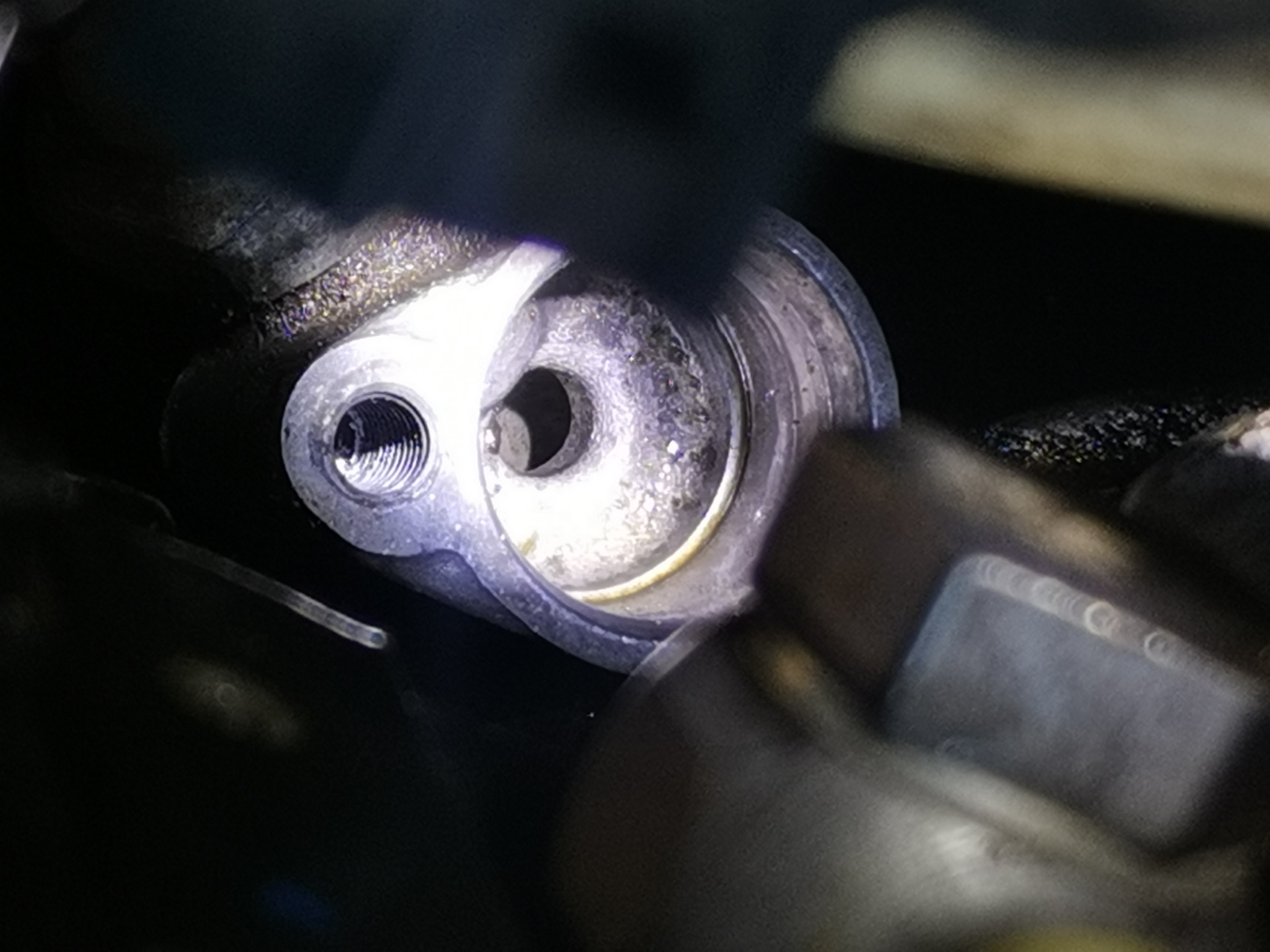Снял и отвёз для обжима в сервисный центр которые и занимаются именно РВД различных типов от изготовления до ремонтов. На все ушло у них минут 15 и шланг переобжатый. На фото подмечено стрелками откуда масло подтекало. Также перед снятием заказал уплотнительное кольцо, шайбы и винт, на фото будет все видно. Перед сборкой все места зачистил и обезжирил. Саму трубку также почистил. Момент затяжки соответственно по мануалу и динамометрическим ключом на фото будет видно каким моментом.