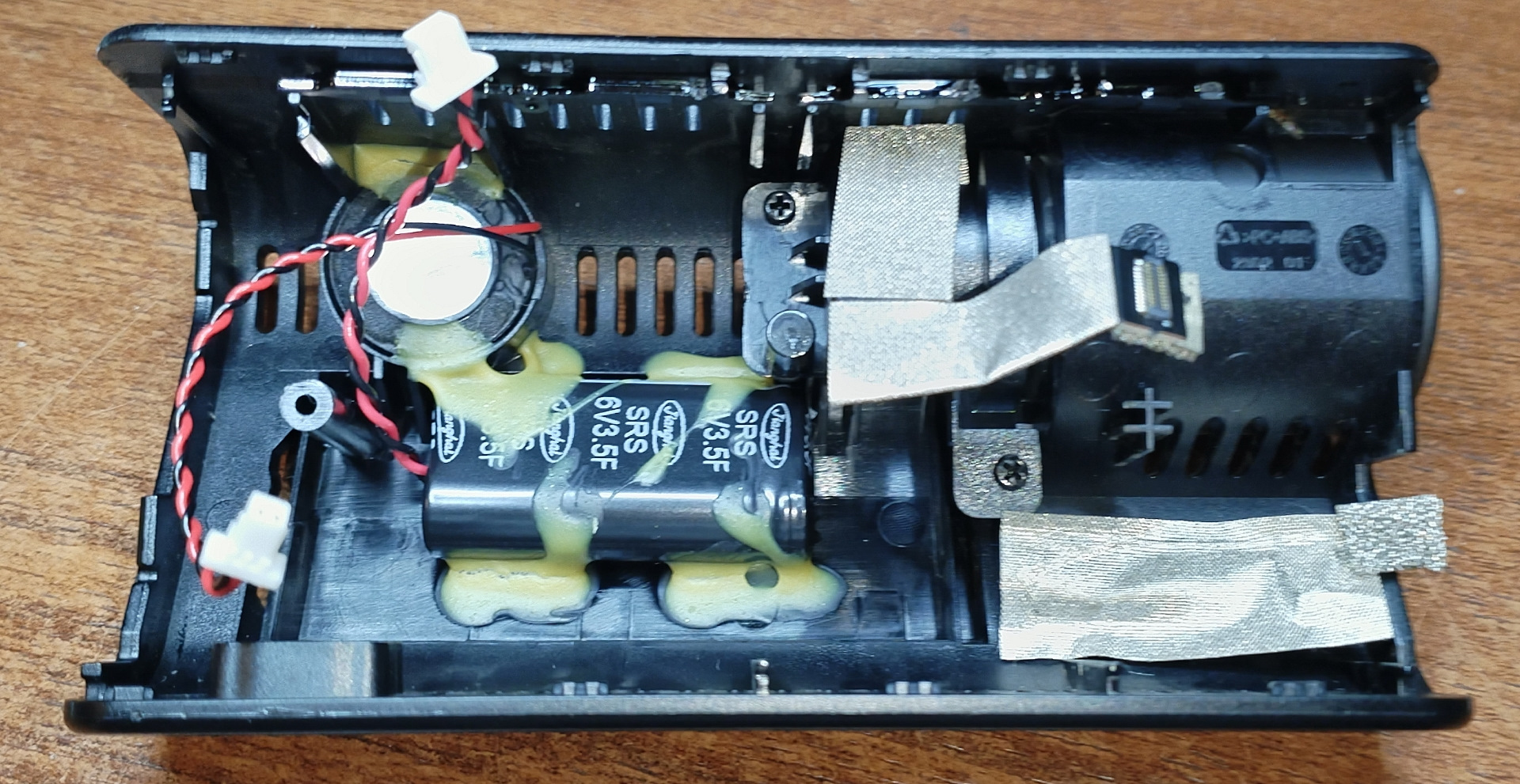 Конрукция начинки регика мне понравилось:основу составляет плата, накрытая радиатором, к плате подсоединены динамик, ионистор, и камера. Под платой — экран. В описании регика говорилось, что в нем небольшой, но аккумулятор. Но нет, теперь точно понятно — ионистор. Отсоединил три разъёма, регик распался на две части.