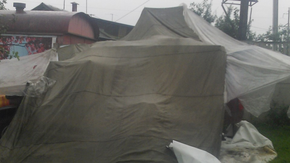 — Если пойдёт дождь, а Вы работаете на улице, то можно использовать вот такой самодельный шалаш!