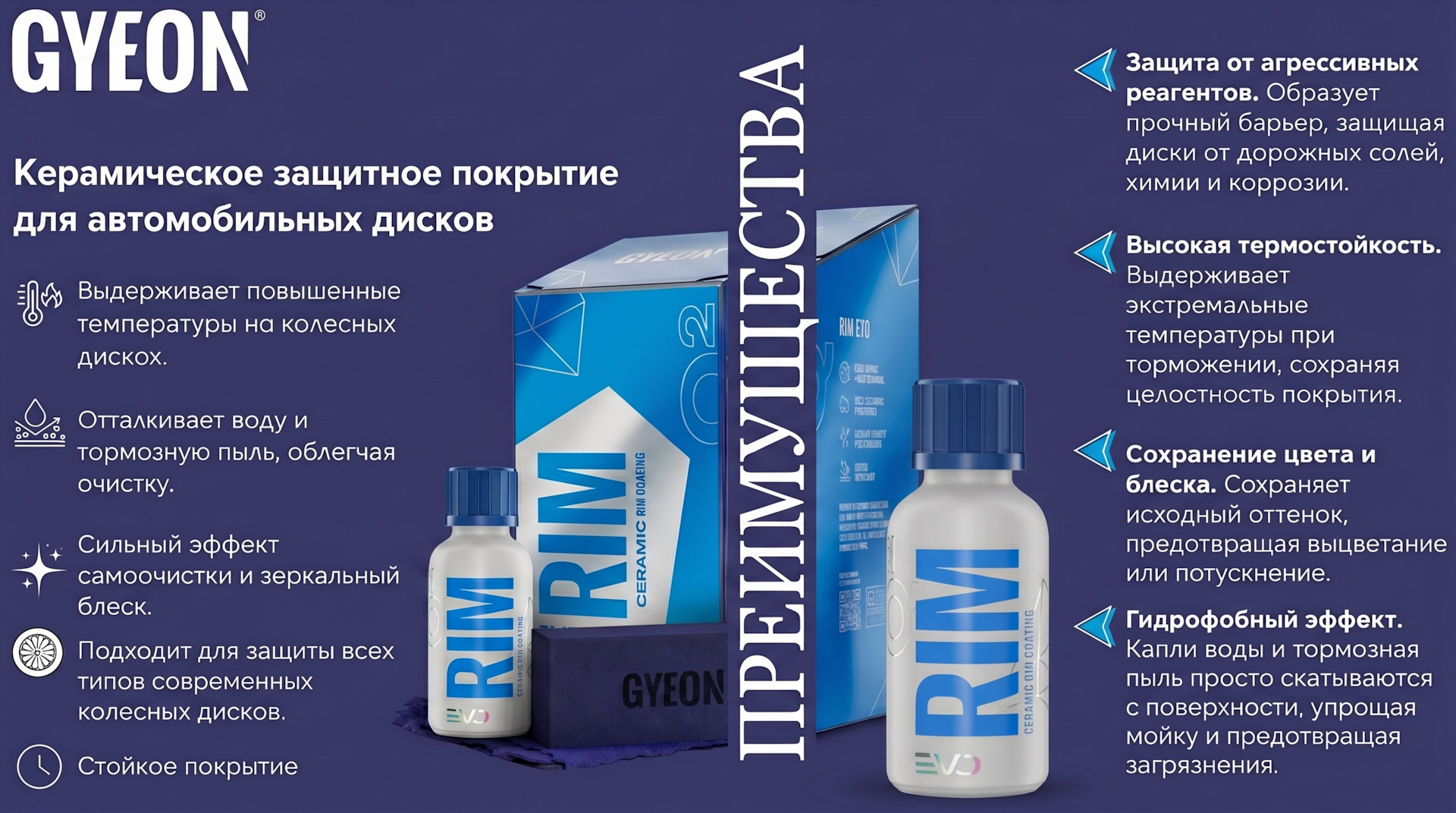 У GYEON, который я использую для кузова, есть отдельный состав Q² RIM для дисков. Он выдерживает высокие температуры, защищает от тормозной пыли и агрессивной химии, а также значительно упрощает мойку.