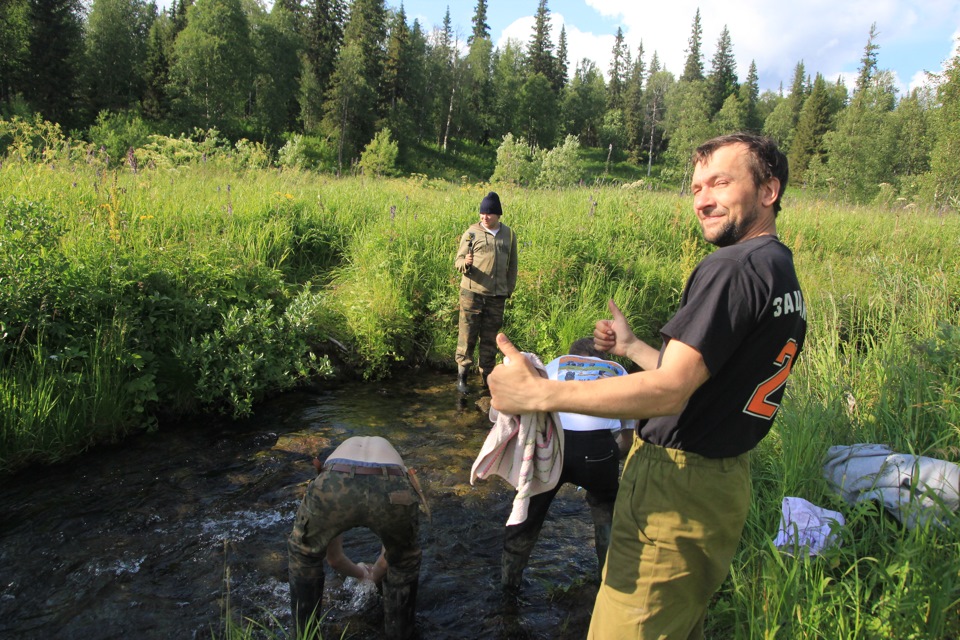 На очередном перевале стоит новый вагончик для егерей. Начинается спуск в лес к Печёре. У Пшона пропадает зарядка аккумулятора. Решаем ехать до места стоянки и уже там ремонтироваться. В лесу проходим ещё один мокрый участок с обилием крупных корней и вот она, крайняя точка путешествия на колёсах – стоянка у великой сибирской реки, которая вьётся здесь маленьким ручейком, шириной в три метра. Принимаем водные процедуры. Экипаж Пшона занимается ремонтом машины – заменяют сгоревший генератор и восстанавливают крепление переднего редуктора. Инверторы отказываются работать — дрелью воспользоваться не представляется возможным. Приходится жечь отверстия сваркой и дальше, старым дедовским способом, обрабатывать напильником. Так подходит к завершению пятый день.