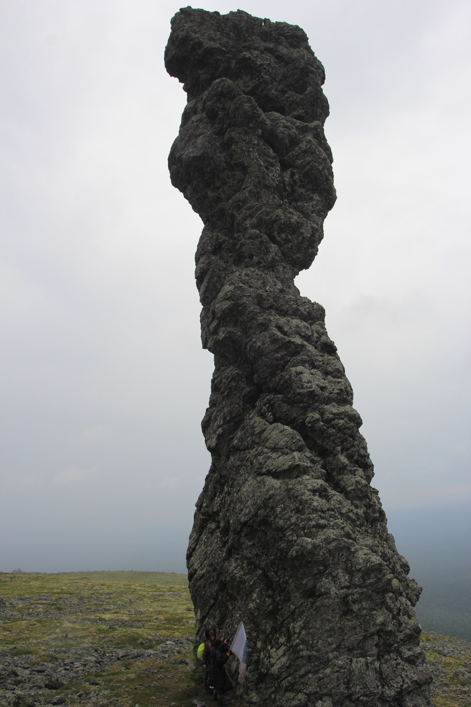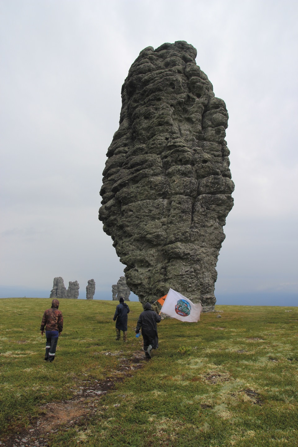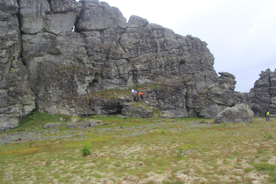 Мрачное утро. Дождь барабанит по палатке. Совещаемся, делать днёвку в ожидании погоды или же, вопреки дождю, подниматься к столбам. Приходим к решению идти сегодня. Плотно позавтракав, экипируемся в дождевики, берём с собой победный коньяк, флаги и выдвигаемся в восьмикилометровый поход на плато. Тропа наверх в дождь представляет собой сплошное верховое болото. Идти в гору не самое лёгкое занятие. Однако, окрылённые близостью конечной цели, поднялись мы очень быстро. Доходим до домика егерей, где нас приветливо встретили и пригласили пройти посушиться. Пока лесные инспекторы выписывали нам незамысловатые бумажки, ветер раздул облачность и столбы, как по заказу, предстали нашему взору во всей своей красе.