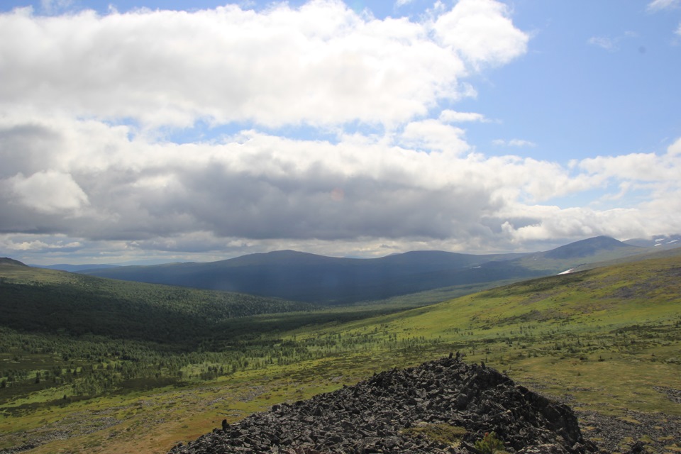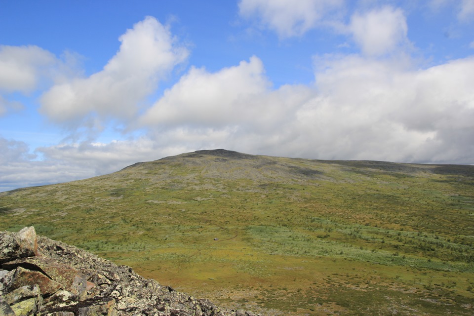 Наблюдаем интересный скалу. Большое скопление курумника между соседними вершинами. Такое ощущение, что каждый проходящий путник приносил по камню и таким образом родилась эта гора. Прямо за ней стоит старая изба. Состояние у неё удручающее, для ночёвки не пригодна.