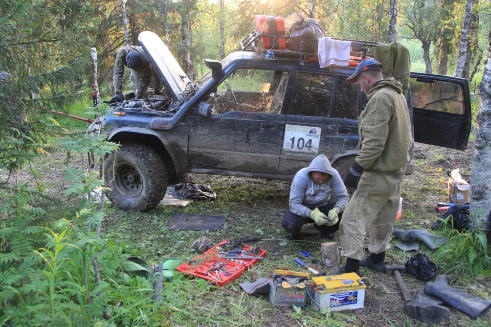 И вновь подъёмы, спуски. У меня начинает всё больше буксовать сцепление. В один прекрасный момент дальнейшее передвижение своим ходом становится не целесообразным. Цепляюсь за Самовара, едем к месту ремонта и последующей ночёвки. Честно сказать, так весело коробку я ещё не снимал никогда. Коллективными усилиями на диком позитиве за четыре часа машина снова в строю. Шиномонтажные работы, подварка рамы у Пшона, ужин, посиделки у костра. На исходе четвёртый день путешествия.