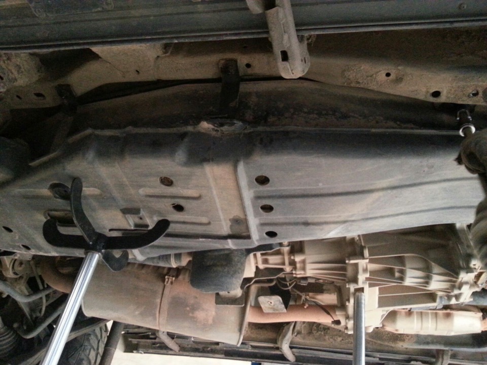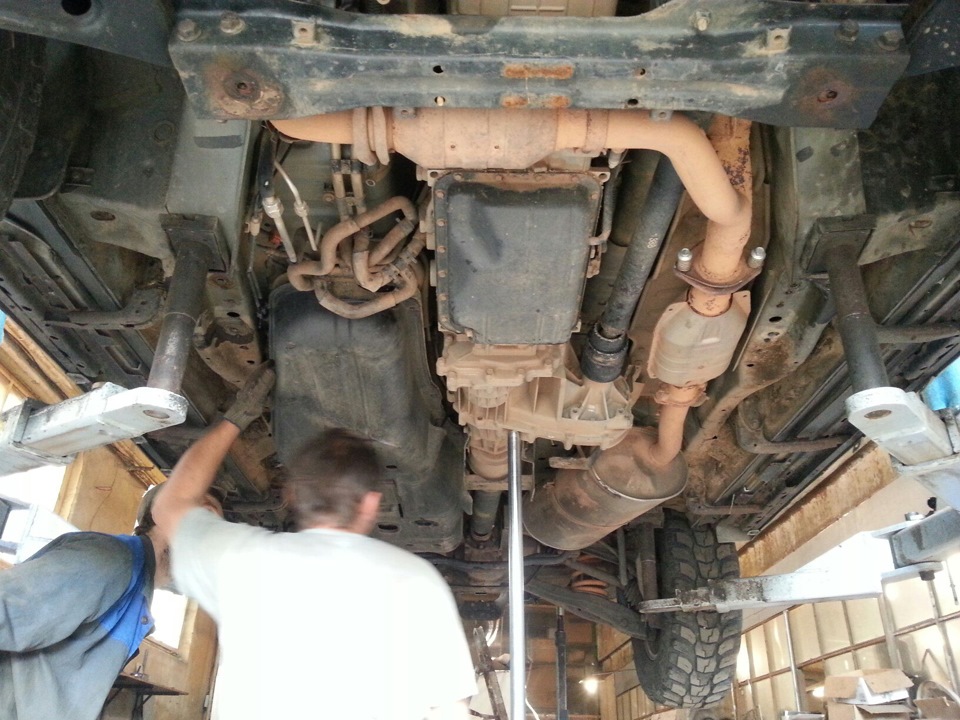 Чтобы нормально поменять бак, нужно открутить траверсу, которая держит АКПП, нужно открутить задний стабилизатор и кардан задний. При откручивании траверсы прокрутился один болт и траверса встала. Парни изъ@бывались как могли, чтобы открутить траверсу. В итоге открутили.