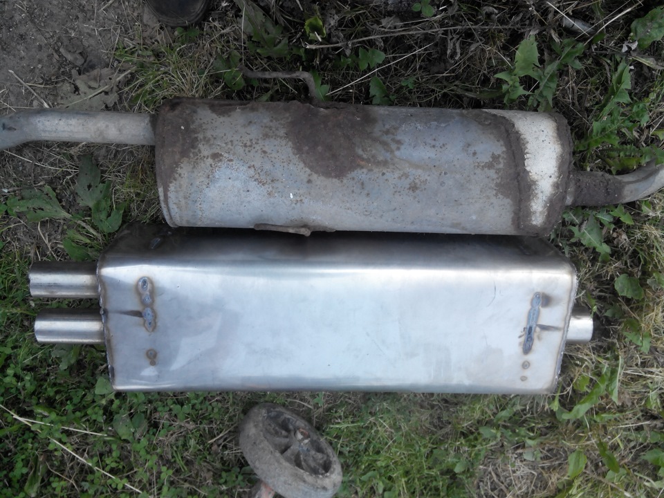 И заварил все к такой-то матери. Глушитель получился скажем несколько больше стока. Для понимания его габаритов сравнил с глушаком от 1,8 (у мишки банки более габаритные, чем у 1,8, поэтому с мишкиным глушителем разница будет меньше).