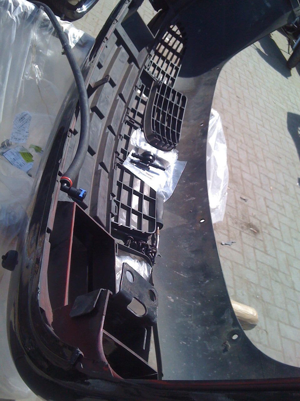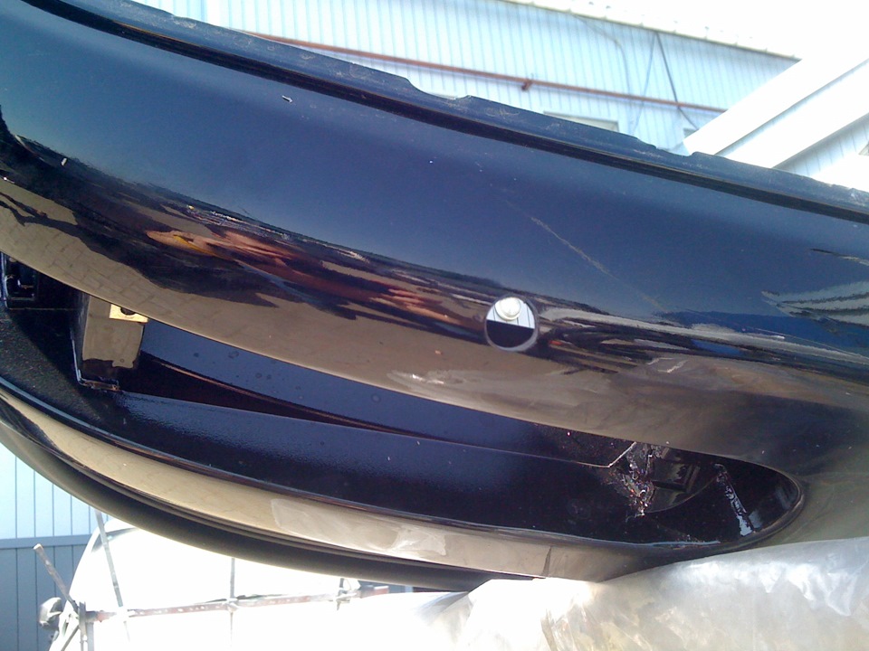 Снимаем бампер, отделяем усилитель бампера от скорлупы, намечаем точки для сверления. Сверлим отверстия 16мм.