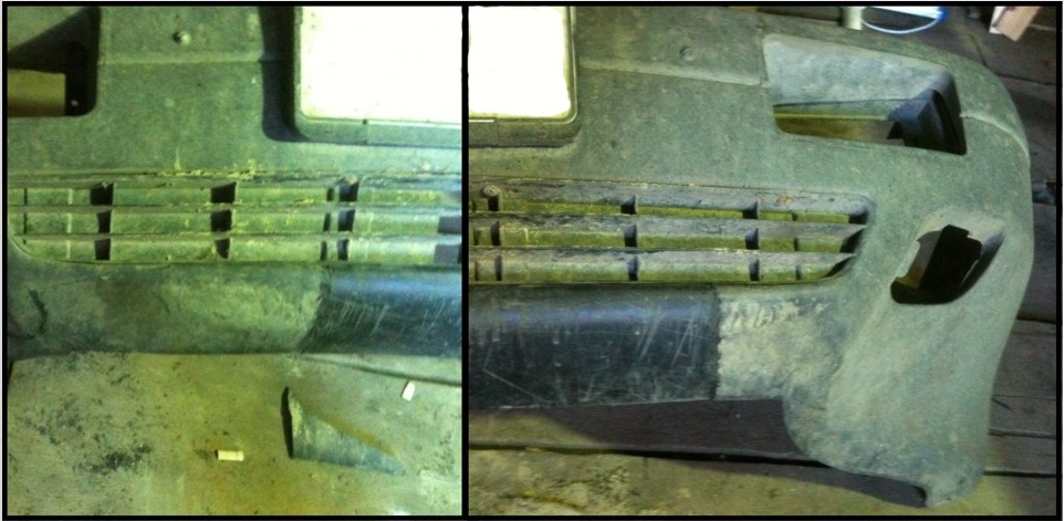 По неосторожности своей, ребячеству с машинкой с новым мотором (а АВК реально валит, по сравнению с 1,8 на солексе!), занижением подвески с поднятого состояния до уровня стока, случалось пару-тройку раз наскакивать бампером на бордюры и кучу песка. Разумеется, такое не могло пройти даром. Ну, собственно, бампер был битый еще с прошлой зимы, когда залетел на ледяную обочину на заносе. В итоге имеем следующую картину: