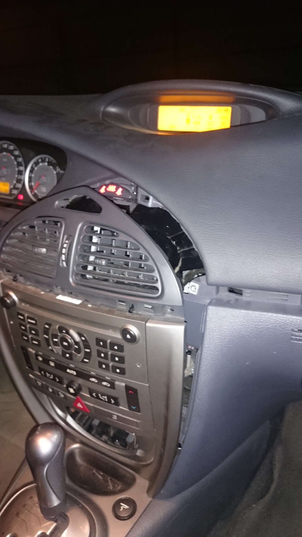 Самое ужасное заключается в том, что верх морды отошел достаточно далеко, а вот низ сидел на своем месте, соответственно магнитола встала под углом и при попытках вставить морду на место магнитола во что-то упиралась… что бы вернуть все на место нужно снимать магнитолу и в итоге весь понедельник я проездил вот с такой красотой: