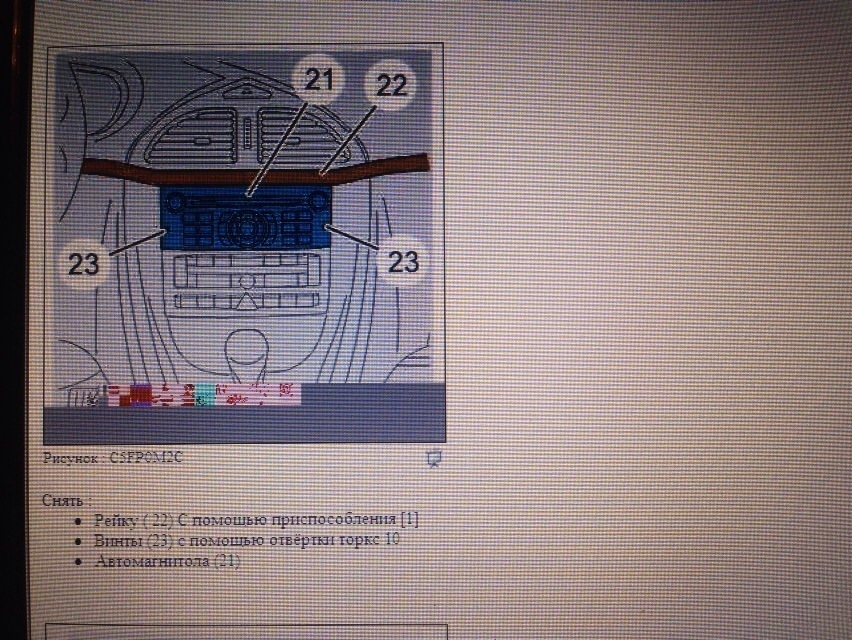 С мыслями о том, что процедура выемки магнитолы и протяжки шнура в бардачек столь же простая задача как и в Х7, расчитывал закончить процедуру минут так через 20. Но не тут то было… Во первых, в отлиии от Х7, в этом поколении на магнитоле всего два отверстия для съемников(угу, конечно… съемников…), на Х7 было четыре отверстия, соответственно имеющиеся у меня съемники не подходят… ну, не беда, диаметр отверстий то такой же… разогнул съмники и принялся пихать, пихал заветные 20 минут, ни в какую… ничего не отщелкивается и ничего не отжимается… Решил попробовать вытащить магнитолу со всей мордой сразу… ну а чЁ?))) снял декоративну соплю, открылись для обзора два болта, выкрутил, начал тянуть, пошло! Ура! Но внизу что то держало…тащить пытался долго, ни в какую, все пальцы пережал, средний до сих пор болит))) Написал DAZIGGY, мол че за… Минут через он мне присылает следующую картинку: