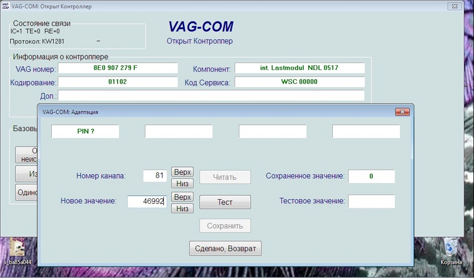 Update: Забыл написать про адаптацию нового блока центральной электроники к машине, а точнее к VINу, т.к. блок был снят с другой машины, и с другим ессно VINом). У меня после установки блока висела ошибка в "мозгах" машины — 01794 блок управления. Введен неверный номер шасси (eng: 01794 — Control Module: Incorrect Chassis (VIN) Number). На машине это никак не сказывается. Разве что морально. Ибо ошибка висела не только в мозгах машины, но и в моих мозгах! … Сначала не понял как это сделать. Не получалось точнее. А вот сегодня получилось. Для того, чтобы адаптировать блок надо зайти в 09 адрес "Центральная электроника" — Адаптация (функция 10) — Канал 81 — В поле ввести 46992 и нажать Тест. В верхней левой ячейке будет написано зеленым ждите (в этой ячейке на фотографии ниже написано: Pin?). Собственно это и надо сделать. Дождаться пока в поле Сохраненное значение не появятся эти самые заветные цифры 46992. После этого нажать Сохранить. Ну а дальше Сделано. Возврат. Ну и Выход, или как там…