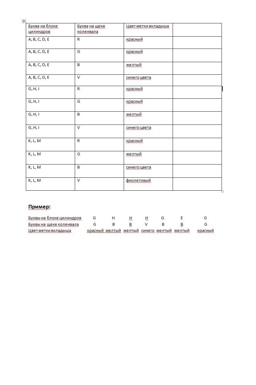 Таблицу я немного подправил и сделал в нормалном виде — еще раз повотряю таблица работает только для моторов 2.8 и 3.2 (проверил — этка тоже выдаёт что в блок идёт жылтый вкладыш, а в крышку по светам, и цветов действительно четыре — красный, синий, жёлтый и фиолетовый), и служит как примером, ну и может помощью хозяевам этих моторов!