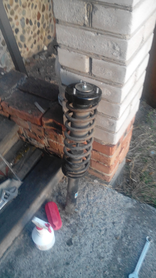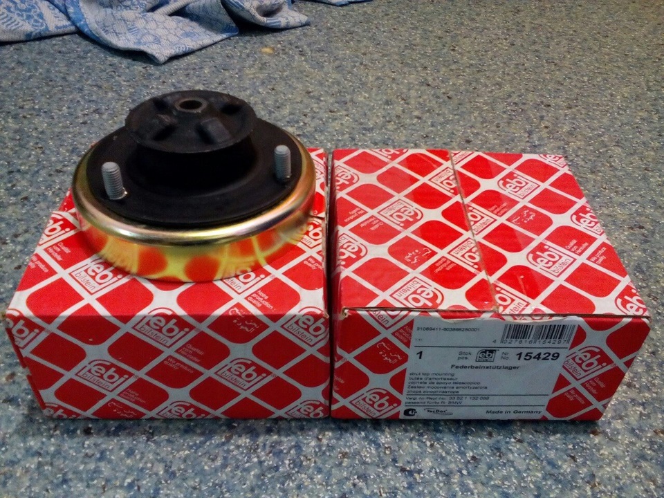 Вот это вот прожило 7 месяцевПосле чего покупаем вот такие вот опорыБерем новую опору, выдавливаем тисками или молотком из нее шпильки, прикладываем с лицевой стороны чашку от старой опоры и керним места под новые отверстияполучаем вот что, и сверлим отверстия примерно на 8, по зубцам на шпильках подгоняемВтавляем шпильки по очереди в новые отверстия с тыльной стороны, с лицевой стороны я лично подставлял головку на 16 и с тыльной стороны забивал их через проставку молотком, на фото слева вы видите готовую к установке на е32 опору, шпильки переместились ближе к центруЕще один момент который хотелось бы заметить, многие наверное и так в курсе, а для кого-то будет полезно узнать, что SACHS, BOGE, Lemferder входят в группу компаний ZF так что все что продается под этими 3мя разными марками по своему содержанию одно и тоже, а вот цены разнятся, так что выбирайте то что дешевле из этих 3х с чистой совестью и собственно фото опоры из коробочки лемфердер, на которой написано БОГЕ, при этом всем такая же опора но с надписью БОГЕ на коробочке стоила дороже. И еще ZF является поставщиком многих запчастей на конвейер BMW так что купив ОРИГИНАЛЬНУЮ опору в ОРИГИНАЛЬНОЙ коробочке не удивляйтесь сильно когда откроете и там будет точно такая же опора с надписью БОГЕ только уже не за 850рТеперь в собранном виде стойка у нас имеет такой вот вид, отмечу еще пару ньюансов 1. Опорная резинка пружины идет в комплекте с опорой от е39, но она нам не подходит по посадочному диаметру на пружину, по-этому ставим свою резинку в корпус опоры 2. втулка опоры на е39 выступает ниже относительно прижимной плоскости пружины, на е32 втулка практически вровень, то есть с опорами от е39 у нас получается шток амортизатора сразу поджат примерно на 1.5 см, что теоретически увеличивает риск пробоядлина втулки в опоре е39 тоже немного длиньше чем у е32, в связи с чем гайка накручивается не так далеко а прям на краю, но ей хватает длины, чтобы держаться всеми витками