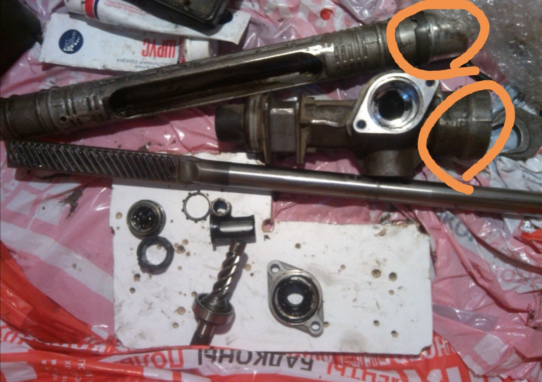 Саму разборку описывать не буду — есть в книжках. Остановлюсь только на том что считаю важным. Снимать левый пыльник с рейки не надо. Выбивать упор рейки из картера не надо, достаточно открутить гайку упора. Трубу рейки от картера можно не откручивать, но мне так было удобнее вытаскивать втулку. Труба откручивается с помощью выколотки (я делал из плоской отвёртки отрезав половину жала) и увесистого молотка. Там дурацкая гайка по типу велосипедных, в первый раз откручивается туго. Чтобы вытащить втулку не ломая её надо двумя плоскими отвёртками с торца рейки отжать фиксаторы втулки, а куском пропиленовой трубы или ещё чем удобным давить изнутри на втулку. Когда труба снята с картера это удобнее делать поставив трубу вертикально и давя на втулку снизу вверх. Втулка легко выходит. Если надо заметить только втулку можно вообще только трубу от картера открутить и даже не потребуется вытаскивать "рашпиль" из картера. "Рашпиль" стоит вытаскивать только если смазки недостаточно.