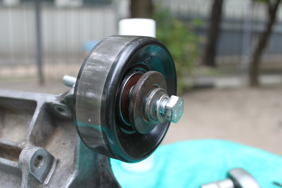 Но при установке возникло несколько проблем — сначала закисший болт, который крепит ролик, никак не выкручивался. С помощью литров WD-40 и растворителя ржавчины кое как удалось его открутить, а вот при закручивании нового ролика в дюралевом кронштейне сорвалась резьба и кусок болта остался внутри…