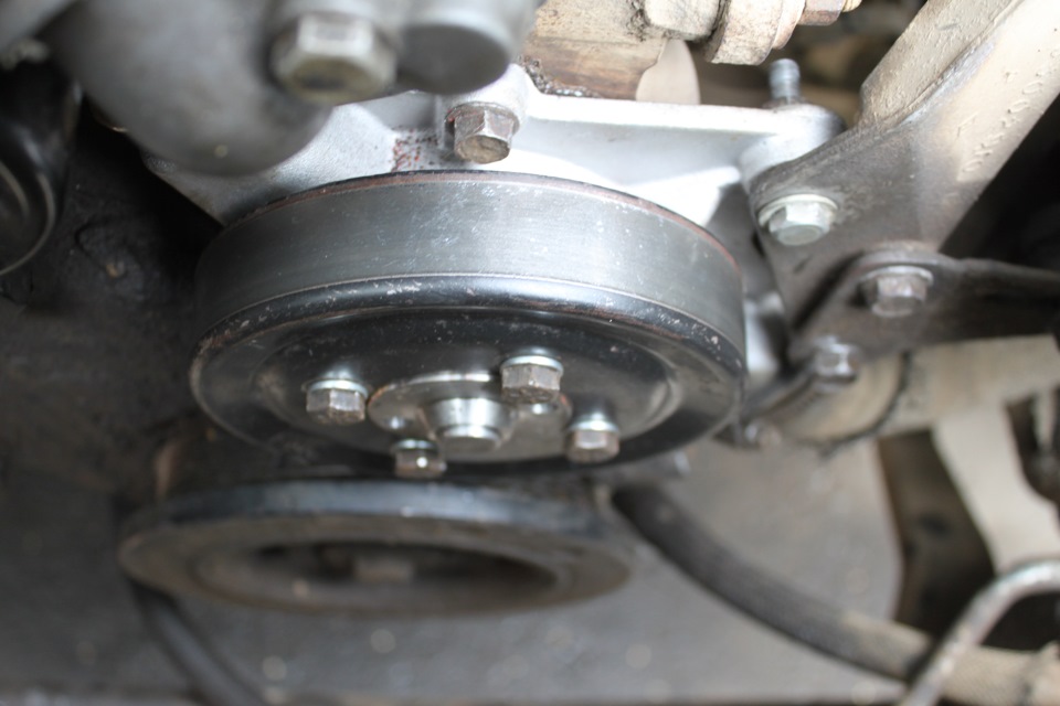 — Затем снимаем шкив помпы — четыре болта на 13мм. Лучше для этого использовать длинную отвертку, её можно "заломить" между шляпок двух болтов, откручивая третий. Откручивать надо не до конца, что бы было за что зацепиться для следующих болтов. И так по кругу. По-другому в ручную снять сложно — шкив прокручивается и дико этим бесит :)