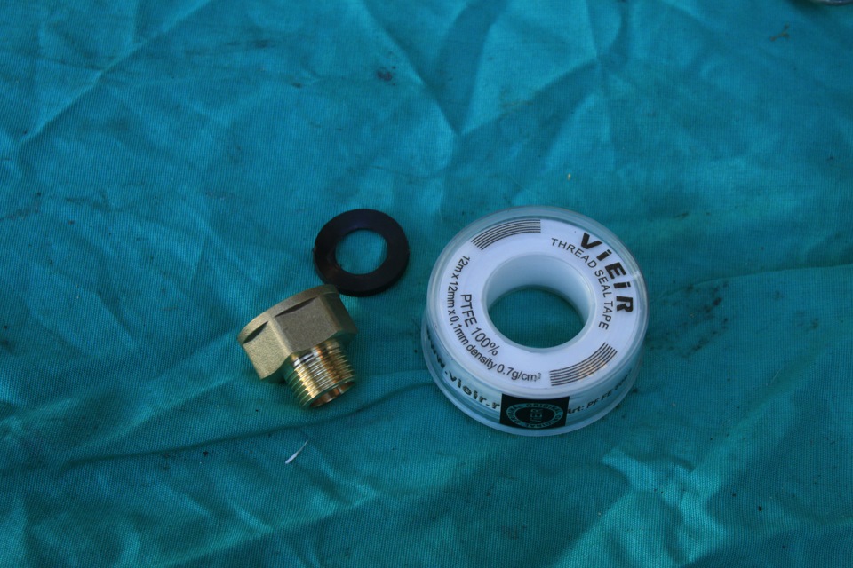 На резьбу намотал ФУМ-ленту (Фторопластовый Уплотнительный Материал). Эдакая современная замена льняным сантехническим ниткам. Ну и положил прокладку между помпой и фитингом.