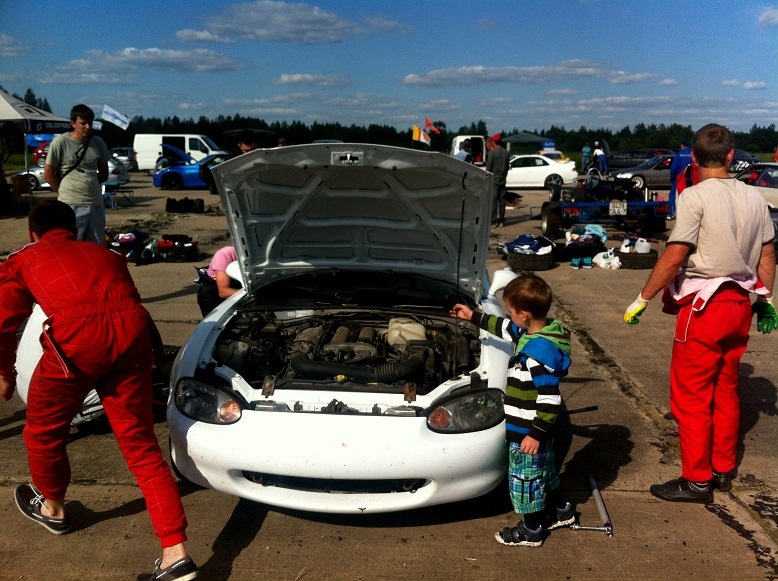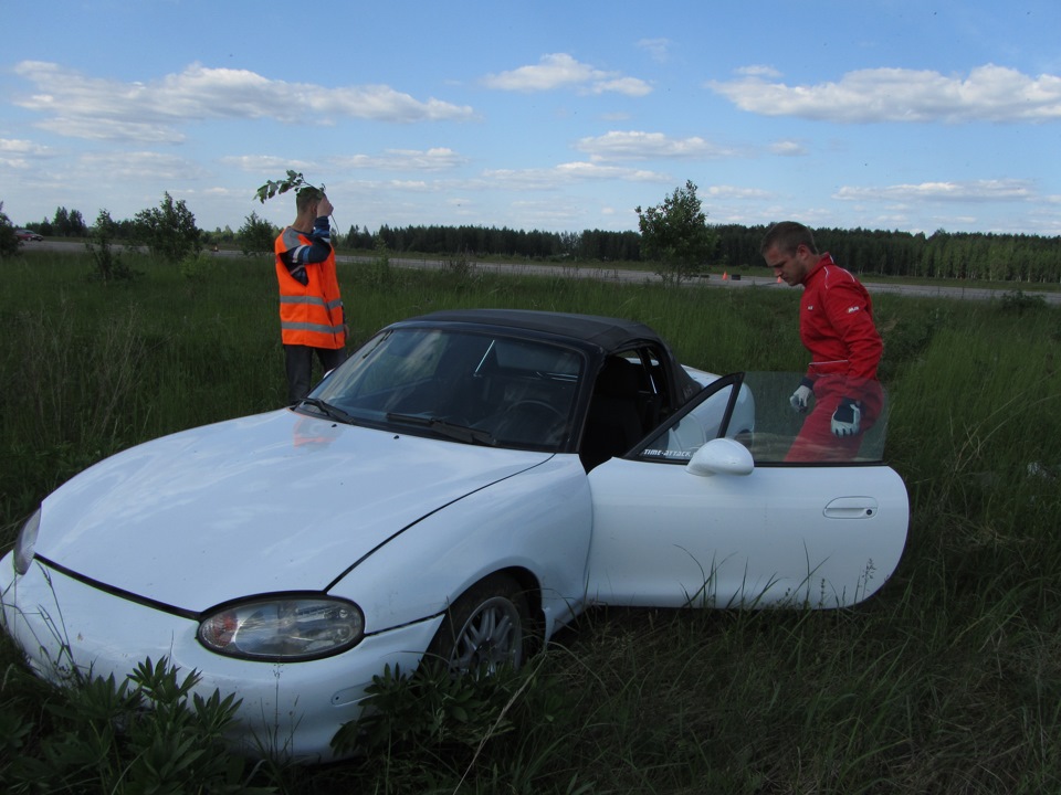 26 мая была официальная тренировка, которая для меня могла закончиться очень трагично. Это моя первая заднеприводная машина, на ней я успел поездить по городу один месяц, естественно опыта и многих понятий еще не хватает. На тренировку поехал в "экономических целях" на обычной гражданской резине, которая меня и погубила. С каждой попыткой скорость постепенно возрастала и на 4 проезде в правом пологом повороте на скорости 130км/ч я плавно улетаю в поле… в голове переворот, больница и т.д. Но мне повезло, может потому-что я просто держал ровно руль, ничего не делал, а просто ждал… получилось перелететь через небольшой ров мимо деревьев и затормозиться в траве. В итоге: сломана пластиковая защита мотора, левый подкрылок, внутренняя часть бампера, сам бампер поцарапан, местами треснута краска.