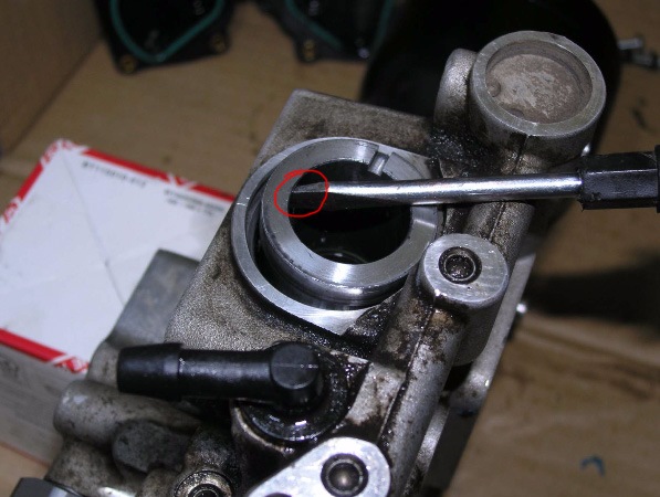 Теперь нюансы, когда вынимал гильзу сцепления, в месте где уперлась отвертка образовался заусенец, он мешал вставить поршень обратно, и был риск его повредить, его аккуратно убрал надфилем.
