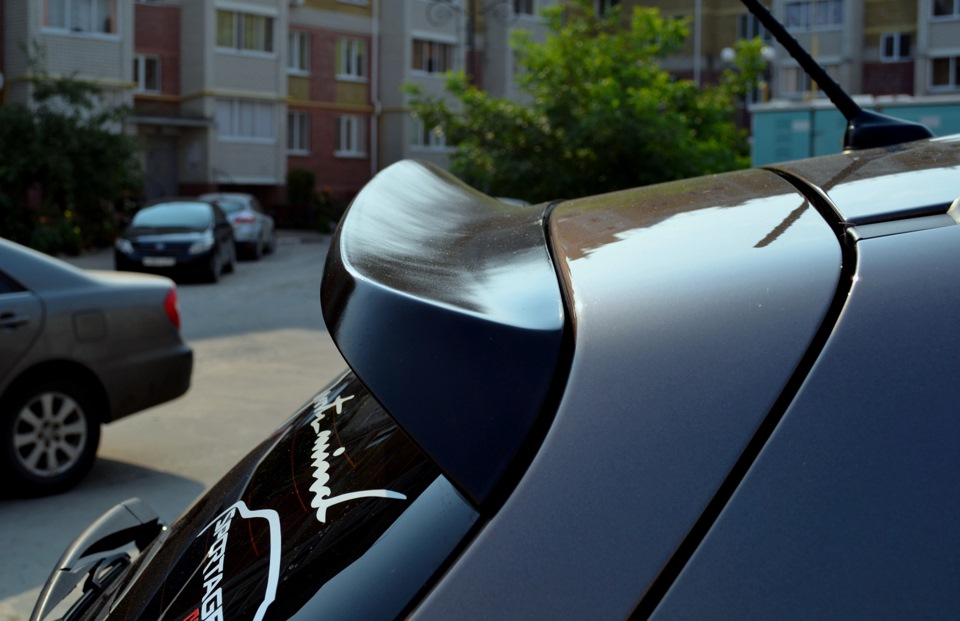 Красить решил сам, сложного особо то ни чего и нет! И так, были приобретены: Баллончик грунта, черная матовая краска, так же один баллон и один баллон лака. Сам спойлер был просто под покрас, так что приступил к грунтованию, в три слоя, с перерывами на 15-20 минут для укрепления, потом 4 слоя матовой краской, встряхивая при покраске интервалами в 20-30 минут! Благо жара, все сохло очень быстро… Ну и напоследок лак, 3 слоя, легкими движениями, ибо он коварен))) можно повесить соплей (подтеков), дать отдохнуть ему))) я дал ему времени до следующего дня!