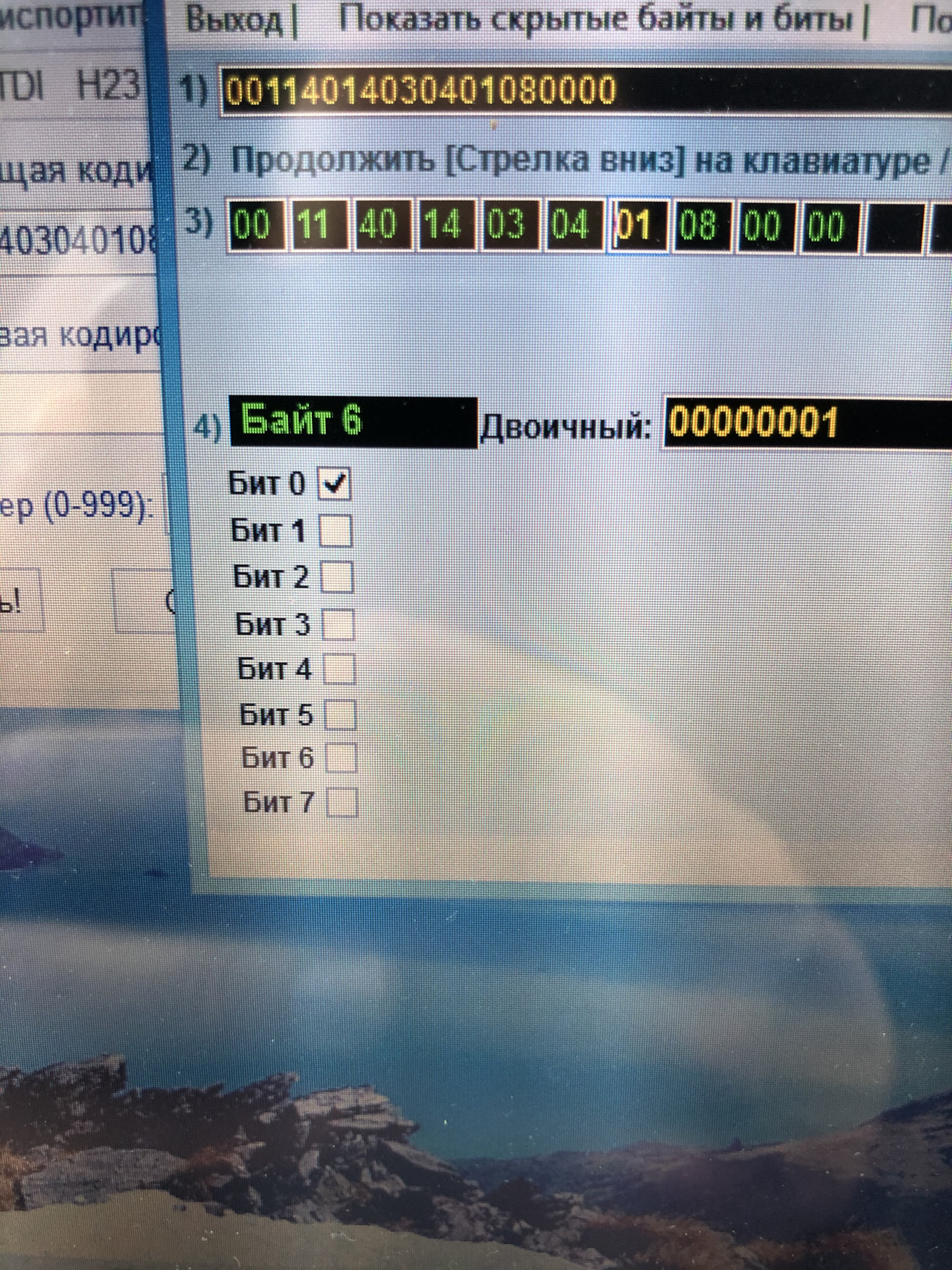 В длинном кодирование открывается наша текущая кодировка из предыдущего окна. Вот тут нам и надо менять кодировку. Смотрим третий пункт из четырех. Они там пронумерованы. В 7 черных квадратах (это байты от 0 до 7) прописана наша кодировка. Нам нужен 6 байт, где у меня было 00 и я поменял на 01.
