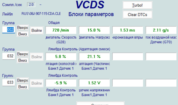 Группа 32: 1) Лямбда контроль 5.8%. 2) Адаптация смеси 21.1%