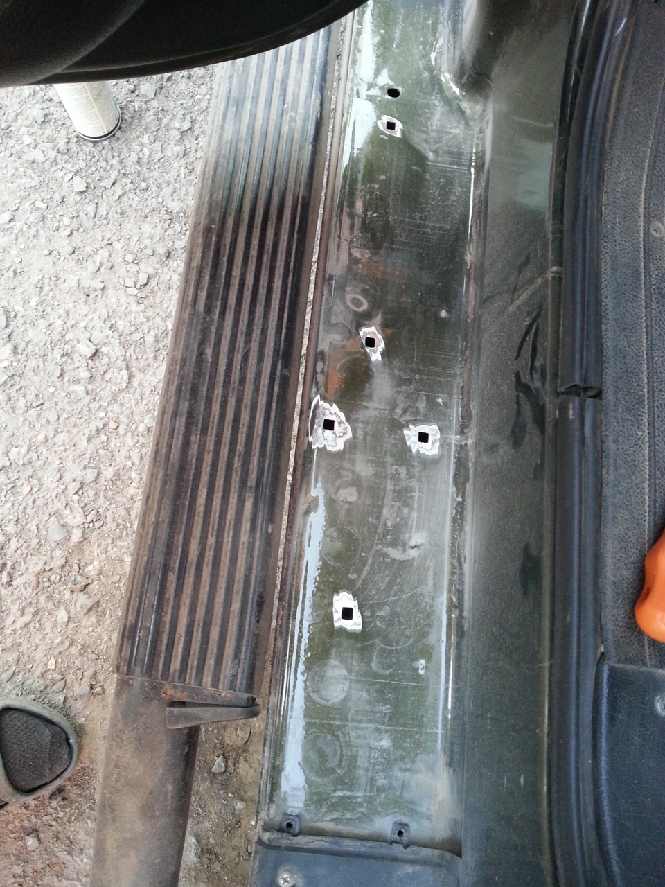 Решил проверить какое состояние порогов под резиновыми накладками, после того как снял накладки в местах клипс, не только у меня но и у всех, т.к. данную тему я уже читаю не в первые, ржавчина начала поднимать краску.