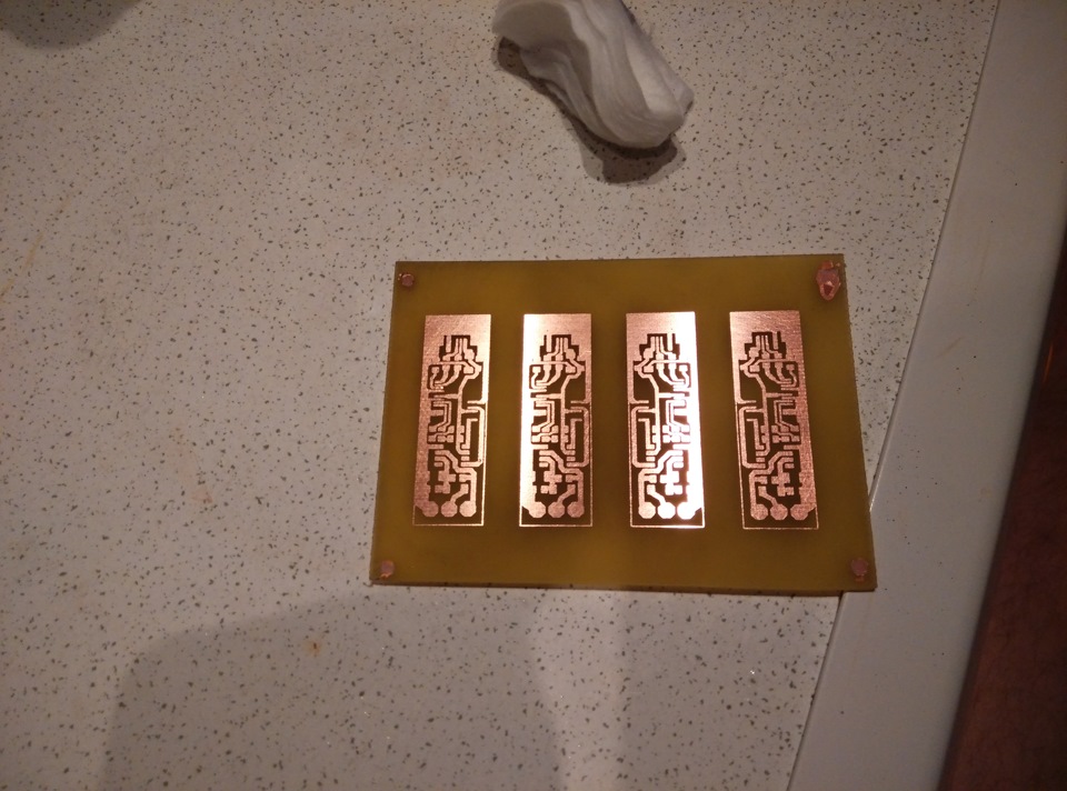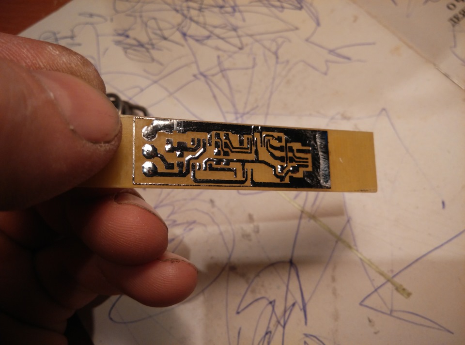 не отрывая листок отмачиваем в воде аккуратно оттирая размеченную бумагу. Протравливаем плату в хлорном железе.