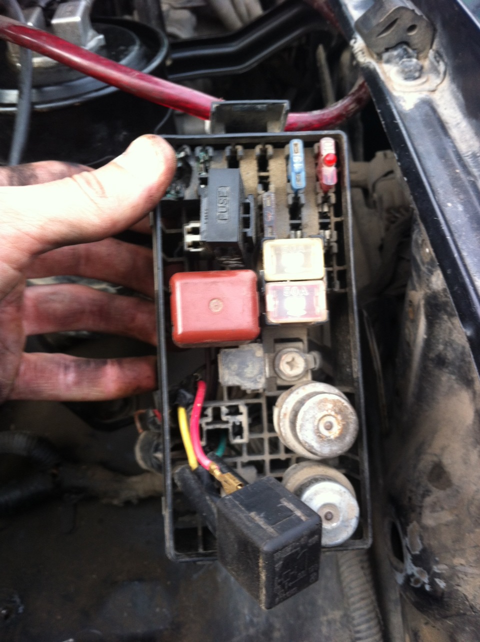 Под конец, решил заменить коробку с реле и предами подкапотную, убрать колхоз и восстановить свет штатный. Сходите в машину, найдите китайские предохранители и выкиньте их на помойку. Принцип работы у них свой, особенный — сплавлю все вокруг, сожгу в уголь, но сам никогда не перегорю. Под большим пальцем на фото видны кратеры, где раньше стояли предохранители на фары. Я потом скрюченные алюмишки, оставшиеся от предохранителей, оттуда плоскогубцами вырвал кое-как. Реле EFI тоже конопатило мозг периодическим неконтактом, на скорую руку было заменено на ВАЗ-продукцию.