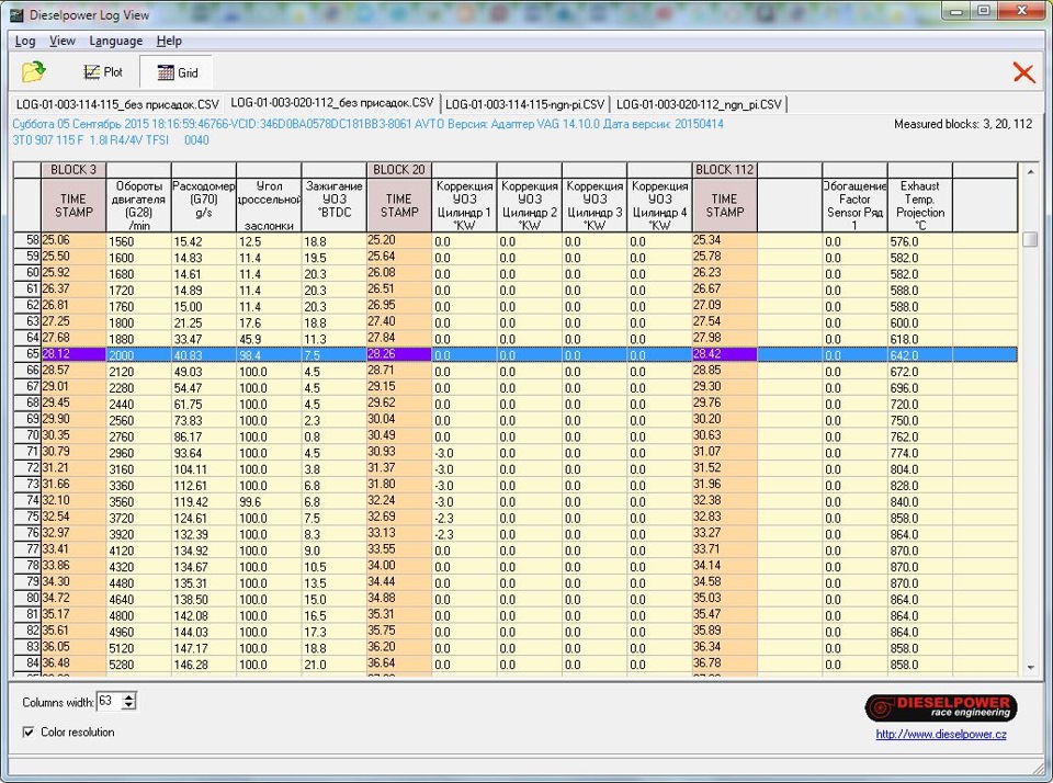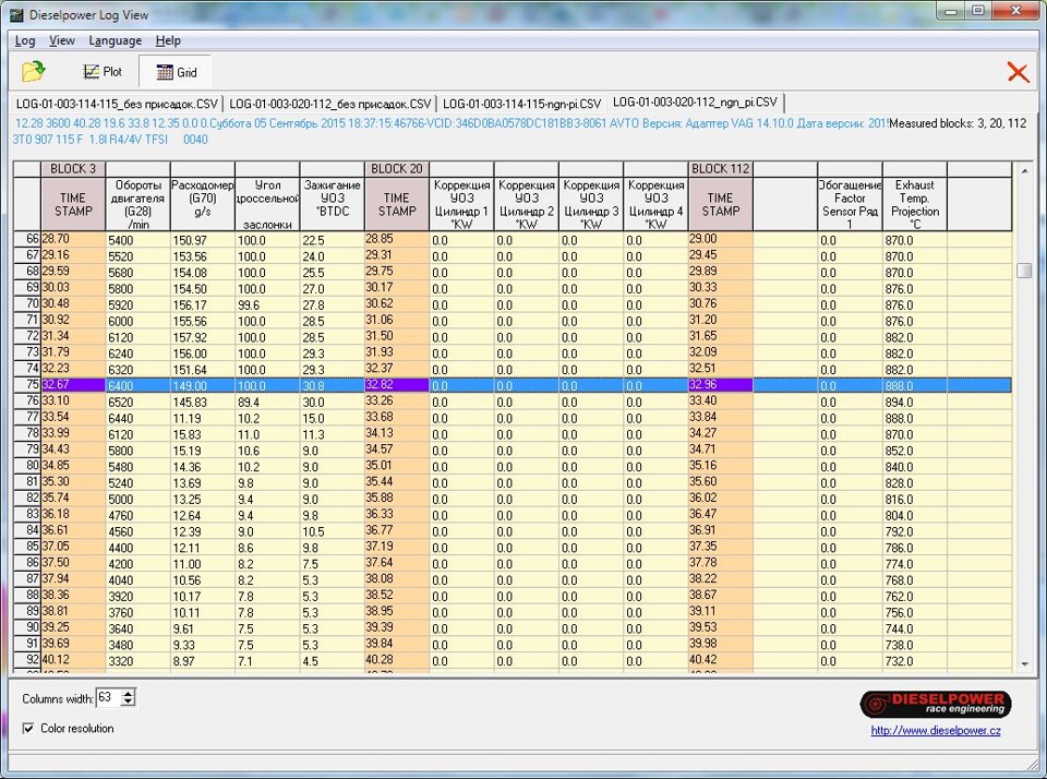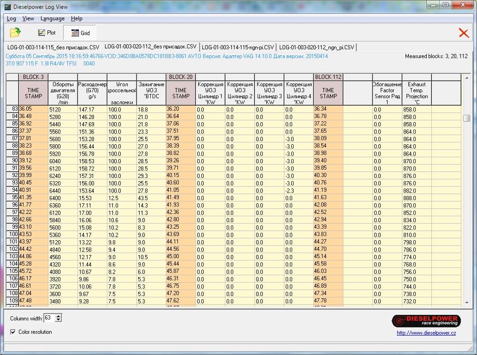 003, 020,112 — откаты по цилиндрам, температура выпуска, дополнительно УОЗ и замер потребляемого воздуха