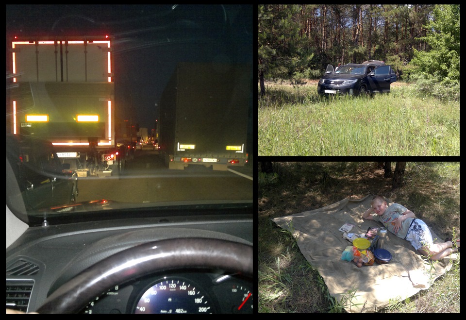 Ехали без ночевок. Остановки только на АЗС, пописить, покурить и перекусить. Но пару раз делали получасовые привалы и устраивали пикник. Менялись с женой местами, то я водила, то она.