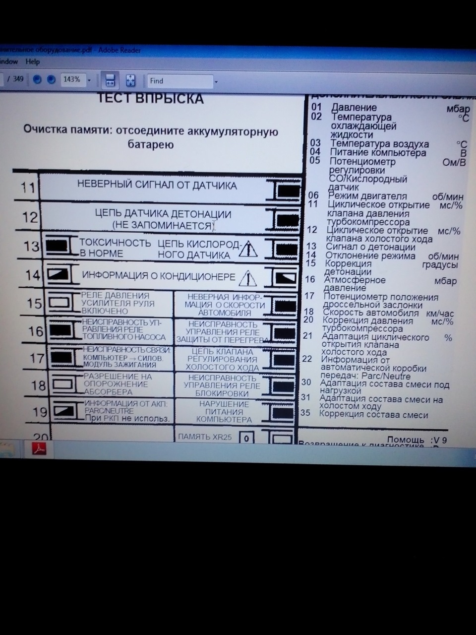 Кому надо скину на почту. Короч подключился посмотрел все хорошо, только вот обороты холостого хода высокие -1200. Решил залесть в регулятор хх. Да и все потрубки пересмотреть на возможный подсос воздуха. Регулятор снялся бнз проблем. Смазка что была вся засохла. Короч почистил все смазал. Так как возникла возможность заглушить клапан ЕГР, сделал и это. Посмотрим на результат. Пока по динамике не ощутил. КОРОЧЕ собрал все обратно. ОБОРОТЫ стали в районе -1000. Многовато. Куда еще копать? Буду изучать литературу. Спасибо всем кто помог по диагностике.