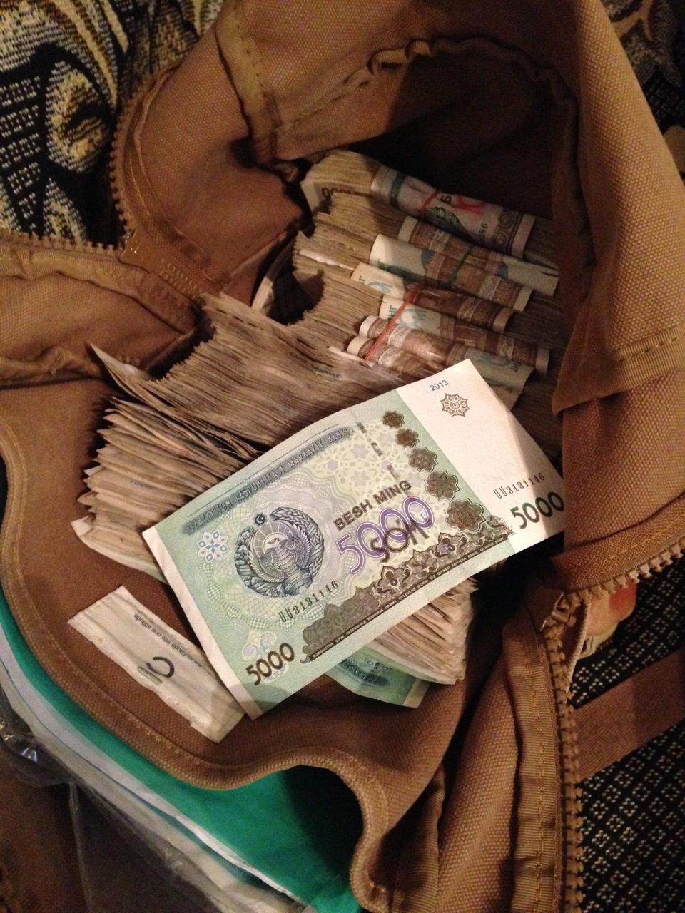 С бабками отдельная тема в Уз. Полный треш. Тысячи бумажек не стоят ничего. Старайтесь обменивать на крупные купюры — 5000 сум, 1000 сум. Не в коем случае не по 200 и не по 500. Иначе три бумажки стодолларовых превратяться в тяжелый заполненный деньгами рюкзак!