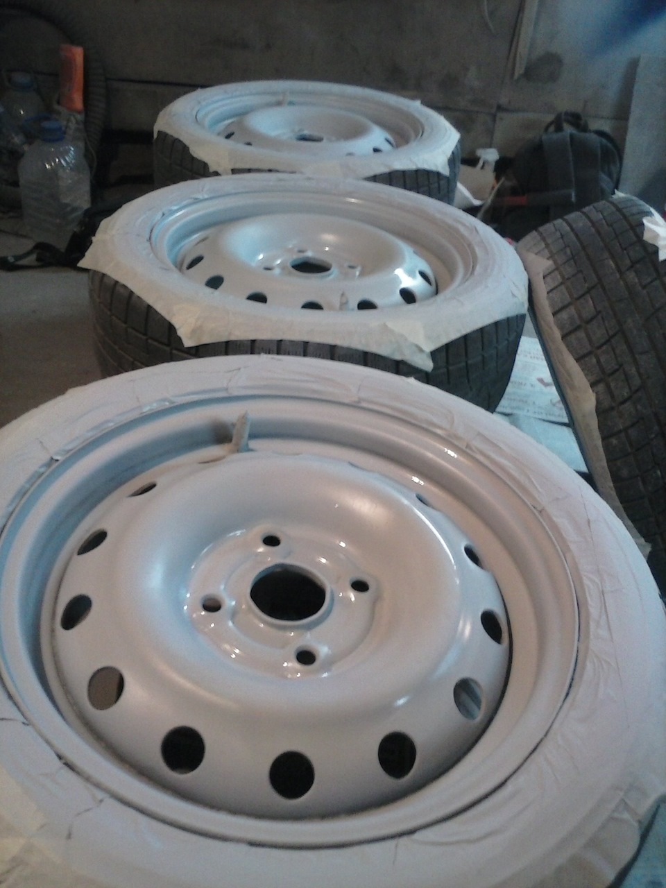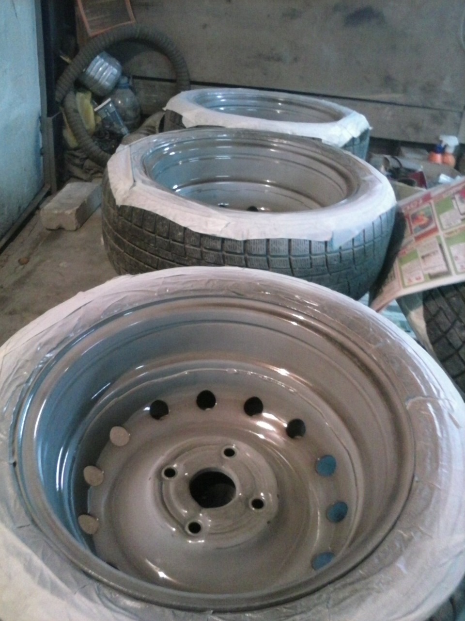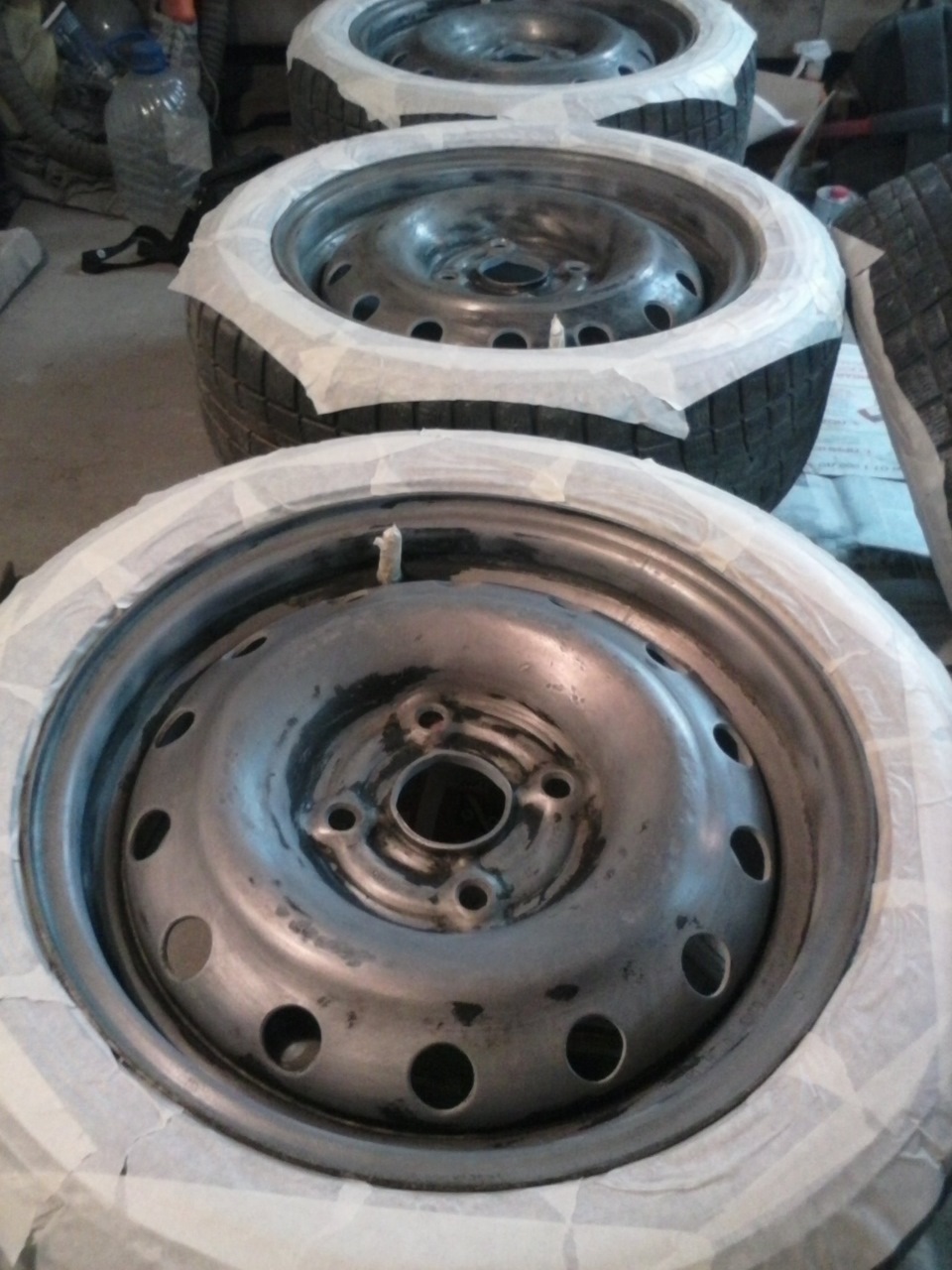 Давно собирался покрасить любимой на Лачети зимние штамповки. Диски были в плачевном состоянии. Все ржавые и гнутые. Пришлось катать 3 из 4-х дисков.