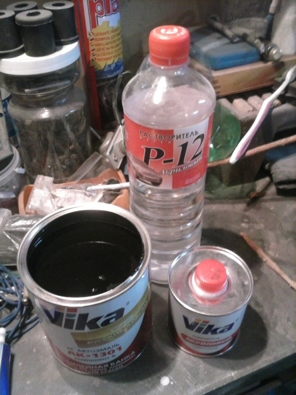 Грунт сох около суток. После чего замывал на мокрую 240, 600 наждачкой. Вновь всё обезжирил и пришло время красить. В очередной раз беру для бюджетной покраски акрил Vika. Краску для тыльной стороны размешал ну очень жидко и долго не мог перекрыть грунтовку, сделал пару подтеков, но зато разлил всё в добротный глянец.