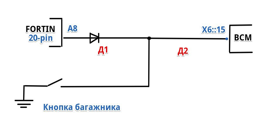 Суть методы — надо найти провод кнопки багажника в BCM и через диод (например Диод Шоттки 40В 3А/80А — 1N5822, www.chipdip.ru/product/1n5822) завести минус, который появляется на нем от нажатия кнопки багажника на соответствующий пин A8 (темно-синий провод) в 20-pin разъеме фортина — можно будет эффектно заглушить авто нажав на кнопку багажника… поскольку у меня доступа к личинке в двери нет — мне это самое то, что дохтур прописал. Прочитать про нужный пин в BCM можно здесь www.drive2.ru/l/5085210/. Короче это разъем X6 (розовый) контакт 15 — третий с низу в самом правом вертикальном ряду (провод желтый с синей полосой) — это контакт который идет с кнопки в багажнике. На нем появляется земля при нажатии на кнопку открытия багажника снаружи.