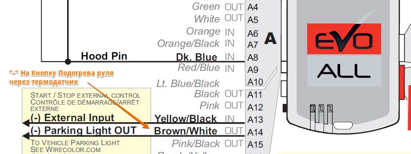 8.8 Подогрев руля — не предусмотрен. Но решением можно заморочиться и вывести через силовой выход фортина — пин A14 (коричневый с белой полосой провод) в 20-pin разъеме — аналоговую имитацию нажатия кнопки подогрева руля — но чтобы не включался и зимой и летом… Можно минус через термо датчик пустить, градусов на 10, чтоб летом не грел. Если потом осилю — отпишусь.
