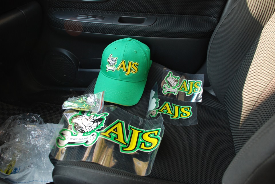 Спустя примерно две недели, после публикации записи про установку упора в БЖ машины, со мной связался solomon-ajs, и сказал что ему понравилась моя правдивая запись, поэтому они решили сделать мне небольшой прtзент в виде подарочного набора от AJS. Конечно мне было очень приятно, я стал с нетерпением ждать этот подарок. Извещение в почтовом ящике появилось в воскресенье, но вот блин в воскресенье почта не работала и меня просто разрывало любопытство. Утром понедельника подарок был получен. В подарочный набор входит: кепка, лямка с карабином на ключи и набор наклеек, все фирменное от AJS.
